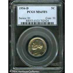 1954-D 5C MS65 Full Steps PCGS. The obverse shows <B>1954-D 5C MS65 Full Steps PCGS.</B></I> The obverse shows touches of light olive-gold, wile the reverse shows the same, only with accents of pale blue around the margins. The motifs are well struck, and a couple of miniscule marks are noticed on Jefferson's face and collar. <BR><BR><B>Important notice:</B> Heritage usually auctions material at the rate of 200-250 lots per hour. On some occasions eBay Live bid software or the Internet may not be able to keep up with the pace of the auction. We recommend placing a realistic absentee bid now as insurance to avoid disappointment. Occasionally the auctioneer may eliminate or reject an eBay Live bid, and the auctioneer may also reopen a lot after the close of the eBay live bidding (usually because we missed an audience bid), and may reject your bid even if it shows you as the winning bidder. By bidding via eBay Live, you agree that Heritage may award the lot to another bidder at its sole discretion under the circumstances described above or any other reasonable circumstances. Since eBay bids are not shown to us until we open the lot on the floor, we treat those bids just like floor bids. In most cases the floor responds before the eBay bid is presented to us, due to Internet lag time, so for consistency we have made it a policy that floor bids are always considered first over tie eBay live bids. Also please note that all Heritage lots purchased through eBay Live carry a 20% Buyer's Premium. Please make sure you read the Terms and Conditions before you bid. This lot is being auctioned in conjunction with a live floor auction by Heritage Galleries & Auctioneers. All final auction and invoice information will be supplied by Heritage Galleries & Auctioneers, and all other information should be considered preliminary. Lot:5644