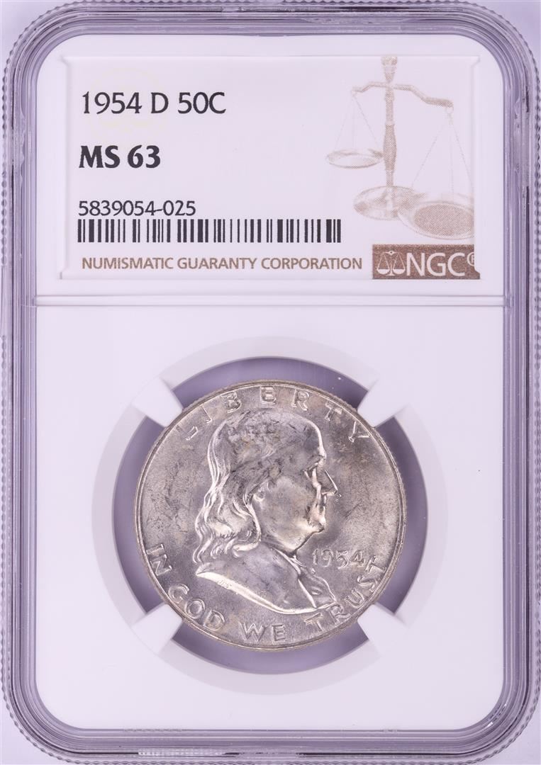 One 1954-D Franklin Half Dollar Coin NGC MS63. NGC Certified.