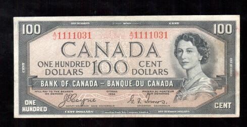 Lot 216; 1954 Bank of Canada $100 Devil's Face Banknote, Coyne-Towers, Serial Number A/J1111031, Fine