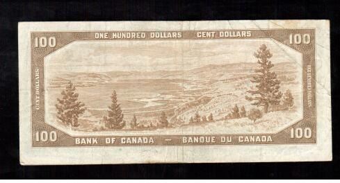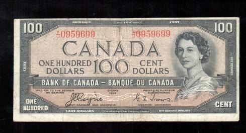 Lot 215; 1954 Bank of Canada $100 Devil's Face Banknote, Coyne-Towers, A/J0959699, Average Grade