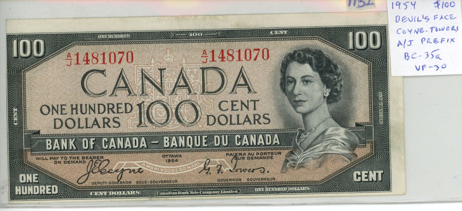 1954 Devil’s Face $100. Coyne-Towers signatures. A/J Prefix. BC-35a. VF-30. Scarce.