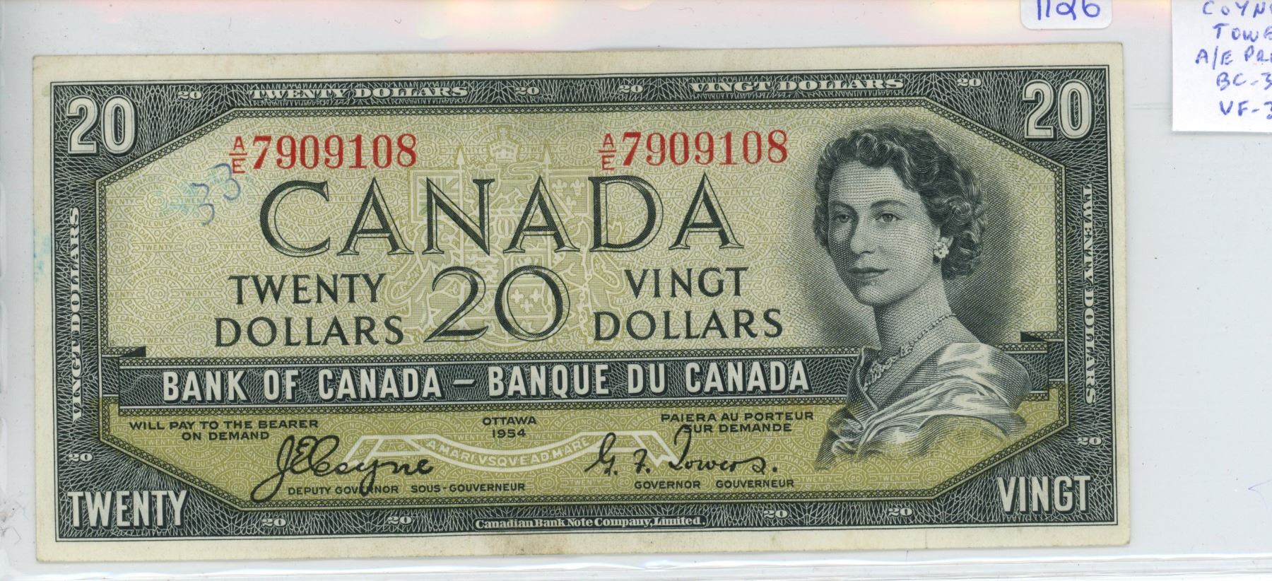 1954 Devil’s Face $20. Coyne-Towers signatures. A/E Prefix. BC-33a. VF-30 with 33 in ink.