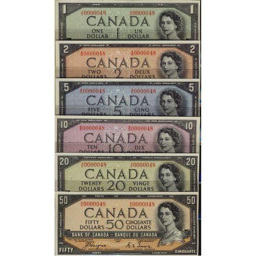 1954 Devil's Face Low Serial Number Set. This is the Coyne-Towers signature set which includes the $1 through to $50 examples in Gem UNC condition #0000048. Very rare as most sets seen on the market only come $1 to $10 and in some cases with the $20. Should bring in a premium.