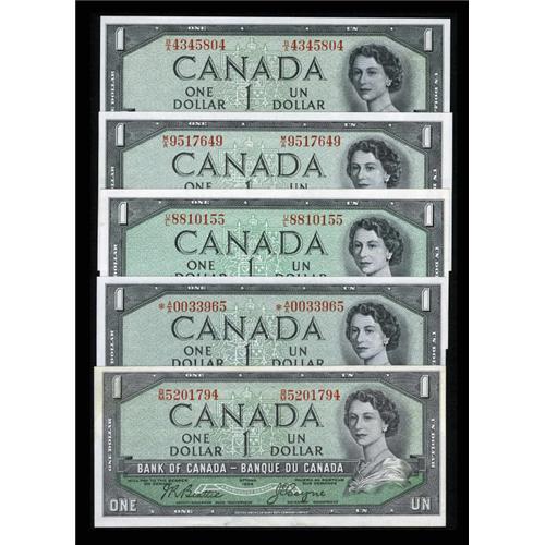 <B>1954 Devil's Face and Modified Portrait $1s</B></I><BR> This lot contains the following <B>Choice CU </B></I>or better $1s - BC-29a; 29b; 37a; and 37aA. Also included is an <B>XF-AU </B></I>BC-37a-i.<BR><I>From The Thomas M. Flynn Collection</B></I><BR><BR><b>Shipping:</b> Coins & Currency (<a target="_blank" href="http://www.heritageauctions.com/common/shipping.php">view shipping information</a>)