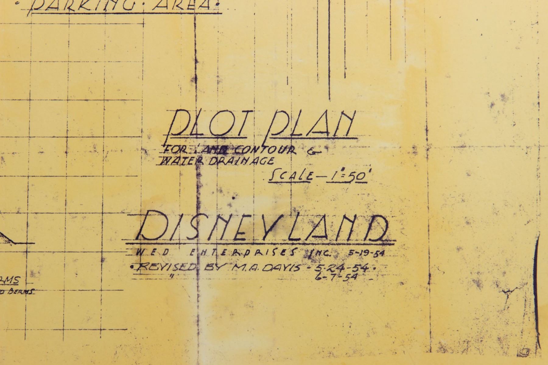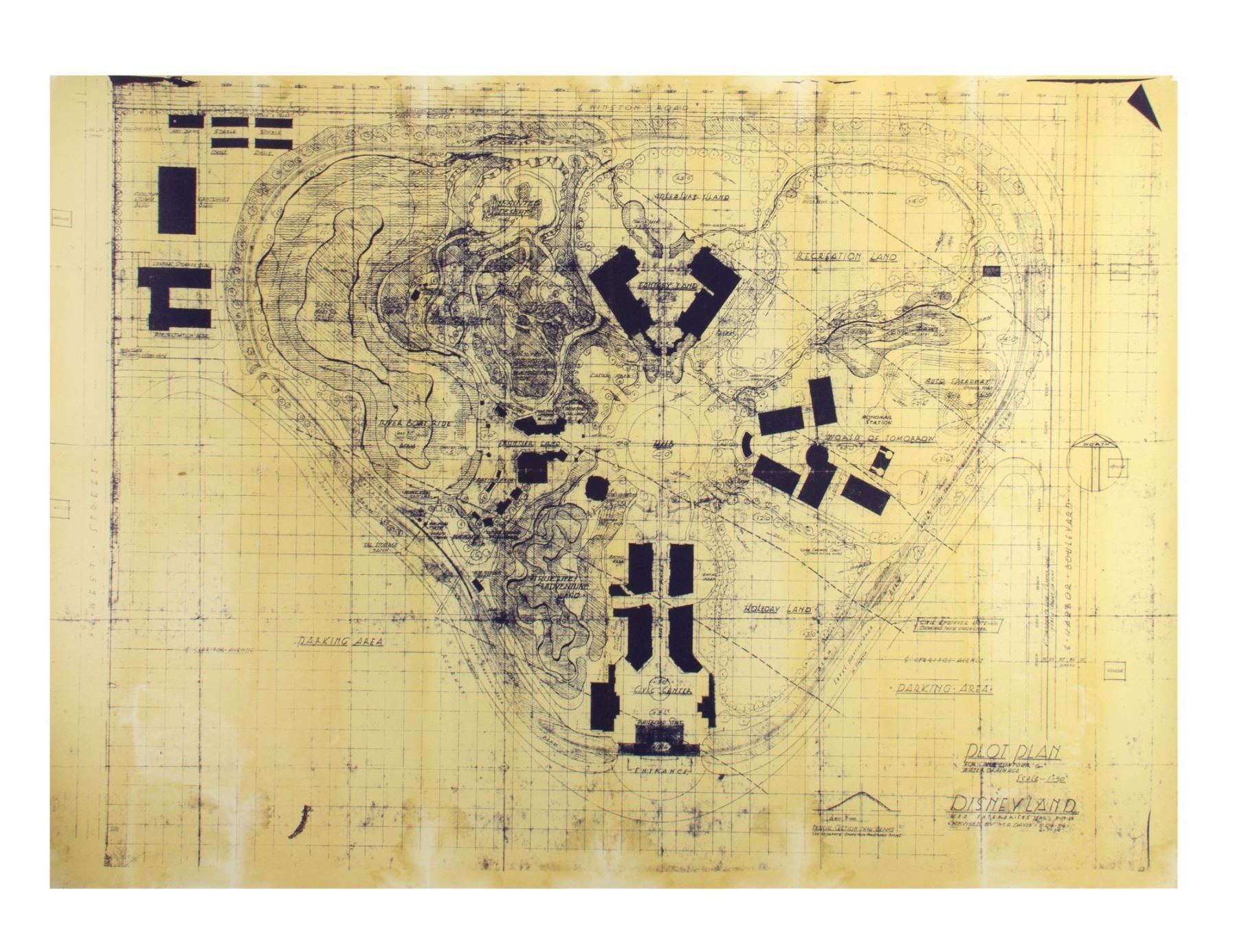 (Disneyland, 1954) A very large early brownline plot plan of Disneyland created by Imagineer Marvin Davis during the construction of the park. Davis, who drew the first diagrammatic sketch for Disneyland in August of 1953, worked closely with Walt to achieve the look and layout that helped turn Walt's dream into a reality. The brownline features Davis' design with a revision date of 6-7-54. The plot plan features several lands and attractions that would ultimately not make it to opening day, including Holiday Land, Recreation Land, and Adventure Island. This early rendition of the park's layout gives us a scarcely seen and historically important look into the development of Disneyland and the minds of the people who built it. Linen-backed for its preservation, the plot plan measures approximately 42.5"x61.5" and is in very good condition with some spots of discoloration and wear from its original use.