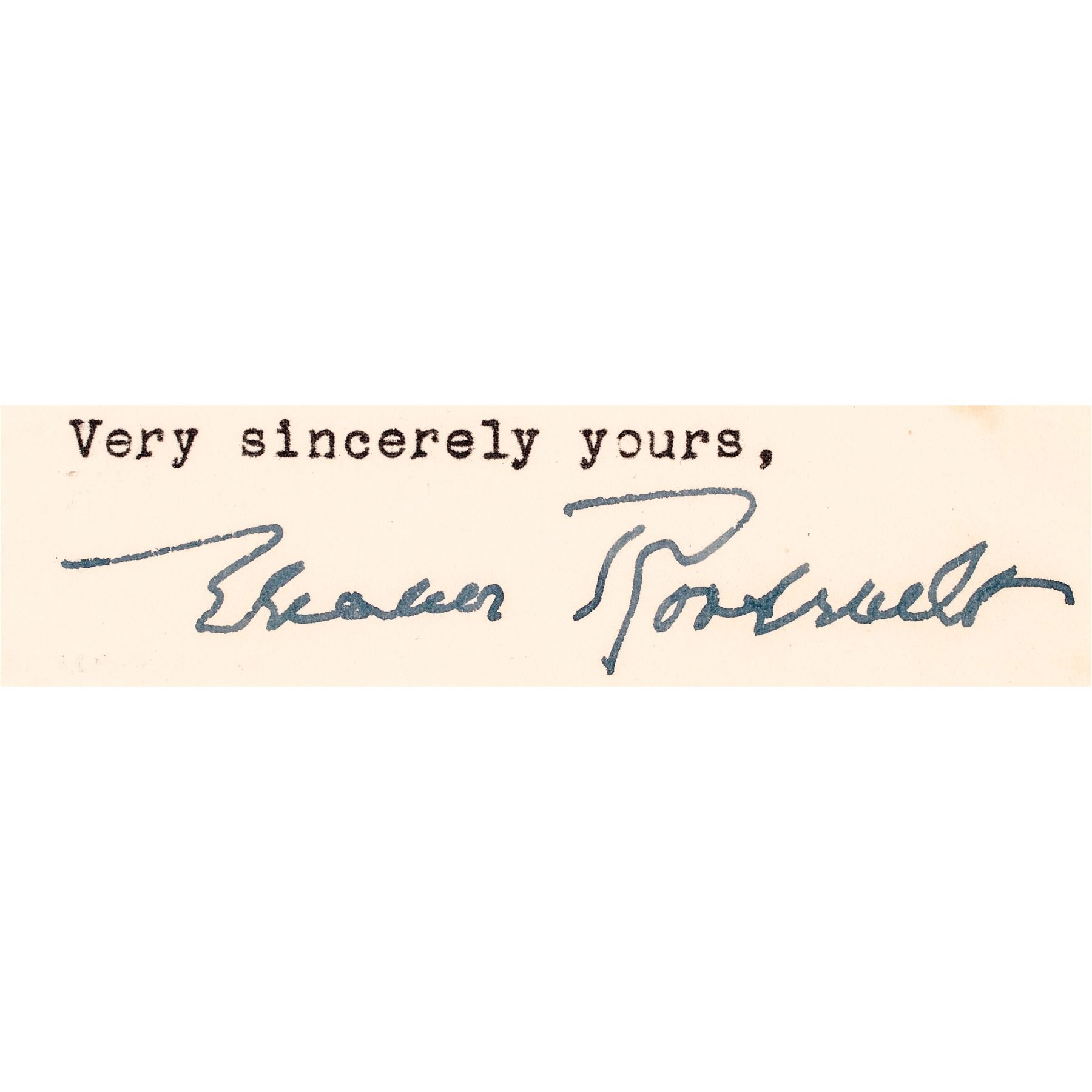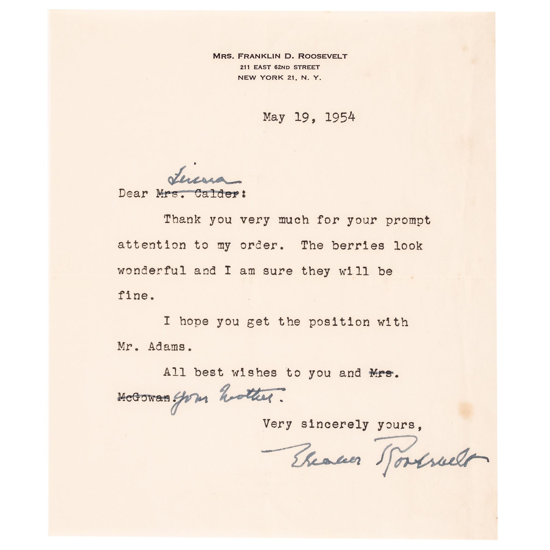 "Dear Linea: - Thank you very much for your prompt attention to my order. The berries look wonderful and I am sure they will be fine. -- I hope you get the position with Mr. Adams. -- All best wishes to you and your Mother. -- Very sincerely yours, (Fully Signed) Eleanor Roosevelt". (2 items)