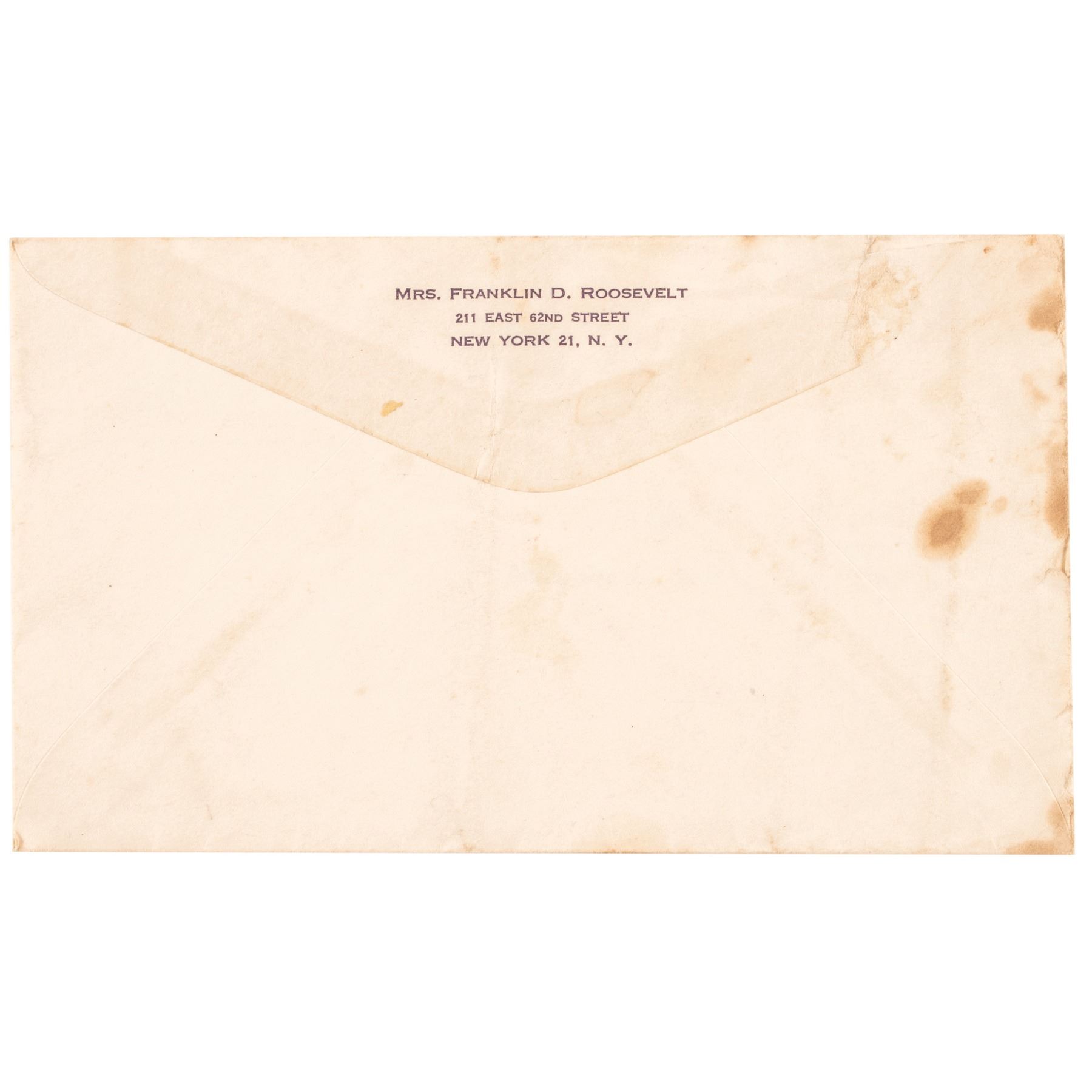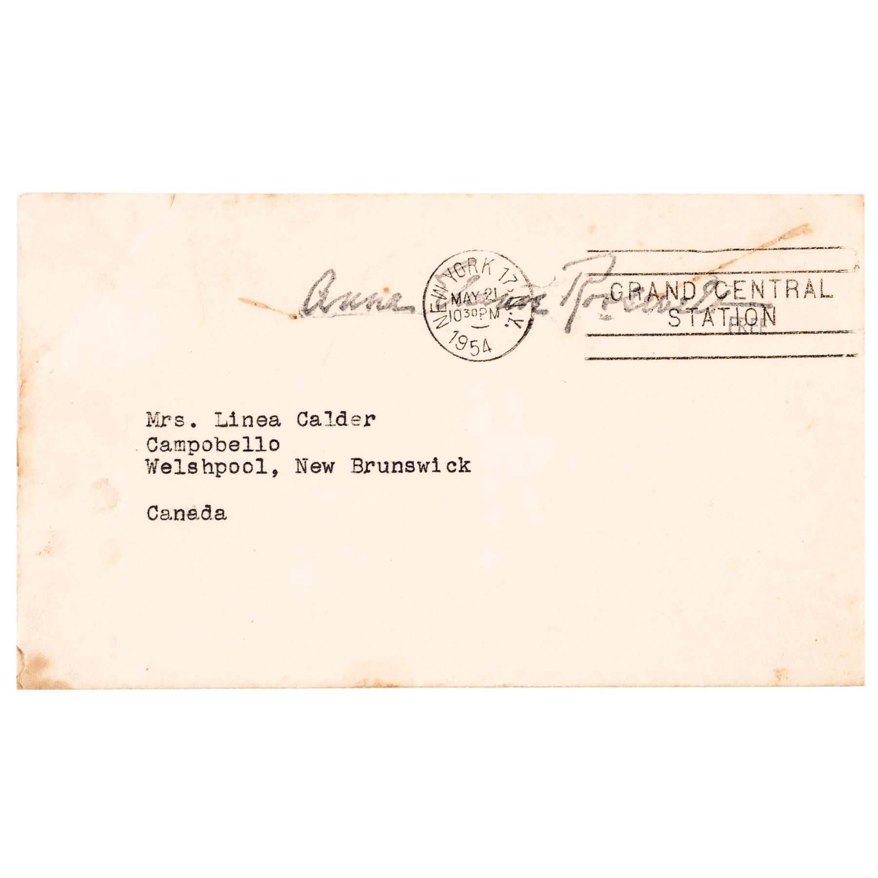 May 19, 1954-Dated, Typed Letter Signed, “Eleanor Roosevelt”, measuring 6” x 7”, 1 page, New York, Choice Very Fine. This Letter contains a few “corrections” in blue ink by Roosevelt’s hand, and boldly signed in blue. Written on her personal stationary to Mrs. Linea Calder, at Campobello, Welshpool, New Brunswick, Canada - Campobello Island was the summer home of the Roosevelt family since 1883. Includes the original Transmittal Envelope, with her hand-stamped Free frank facsimile, "Anna Eleanor Roosevelt", and "FREE" handstamp. Unusual content, in which Eleanor Roosevelt writes her “Thanks” for sending her order of berries from Campbello, which arrived and "look wonderful". This letter reads, in full: