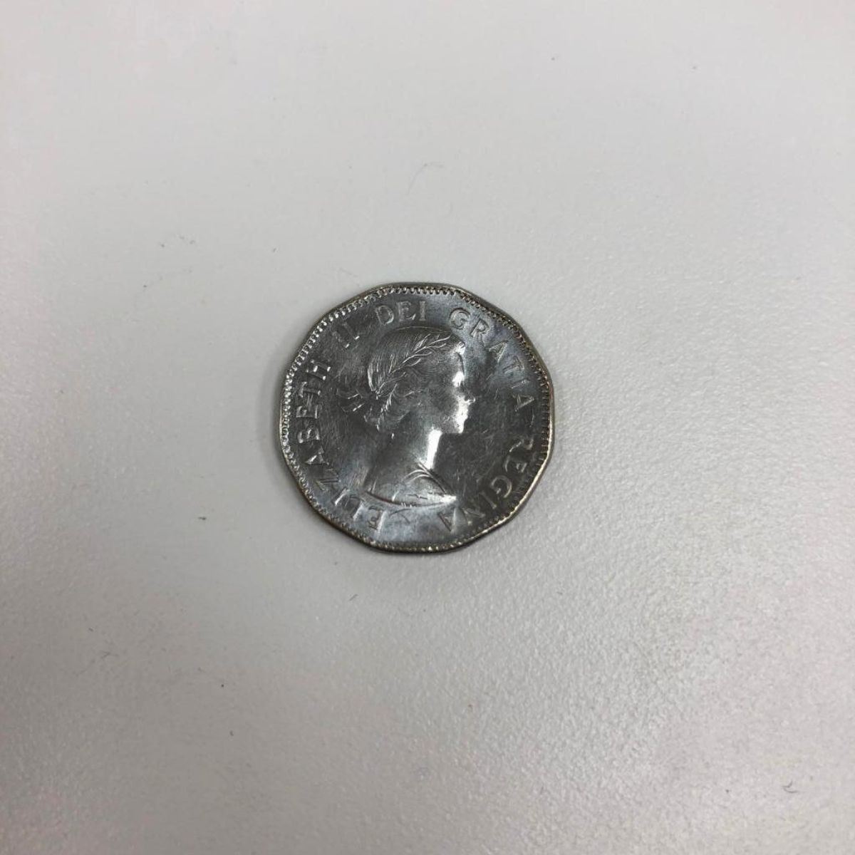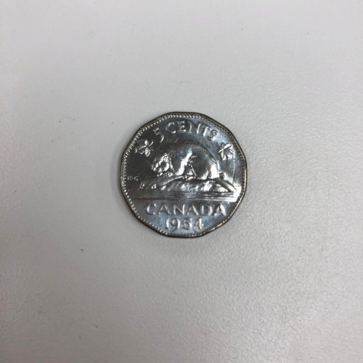 Obverse The portrait in right profile of Elizabeth II, when she was 27 years old, is surrounded with the inscription "ELIZABETH II DEI GRATIA REGINA" (Elizabeth II, Queen by the grace of God) Lettering: ELIZABETH II DEI GRATIA REGINA M·G· Engraver: Mary Gillick Reverse A beaver, over the inscription "CANADA", is surrounded with the face value, flanked on both sides by a maple leaf. Lettering: 5 CENTS K·G CANADA 1953 Engraver: George Kruger Gray Specifications Country: Canada Type: Standard circulation coin Years: 1953-1954 Value: 5 Cents (0.05 CAD) Composition: Chromium plated steel Weight: 4.54 g Diameter: 21.234 mm Thickness: 1.70 mm