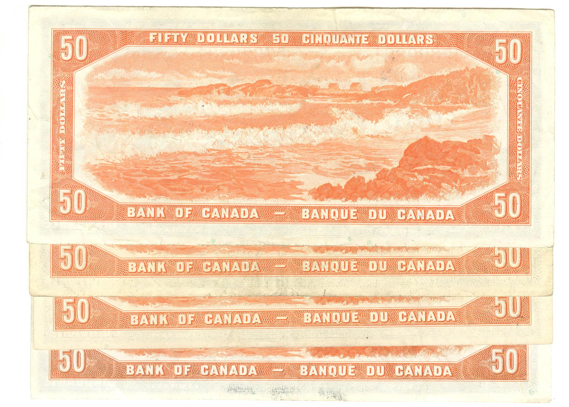 1954 Fifty Dollars Modified, BC-42a, VF, Beattie Coyne, serial A/H2621679 & BC-42b, All VF, Beattie Rasminsky, serial B/H4016145, B/H4204789 & B/H7629801. Lot of 4 notes.