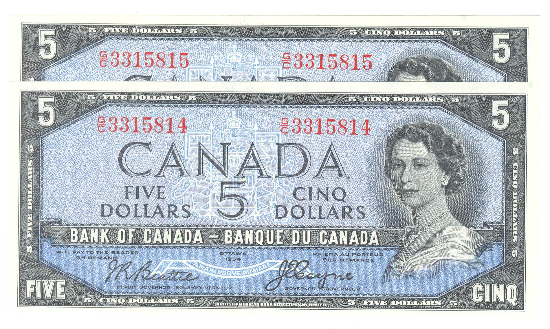 1954 Five Dollars Devil's Face, BC-31b, 2 Consecutive Choice UNC, Beattie Coyne, serial G/C3315814-15.