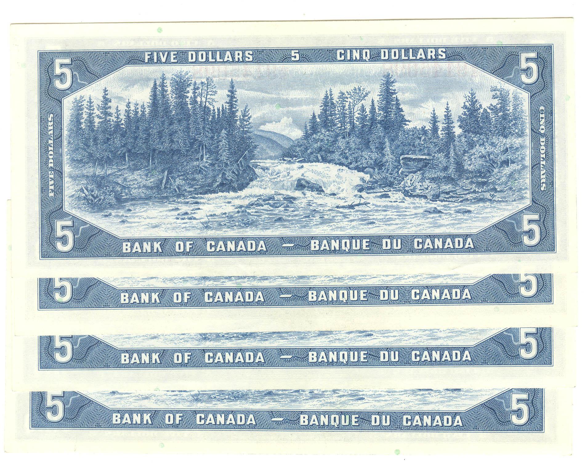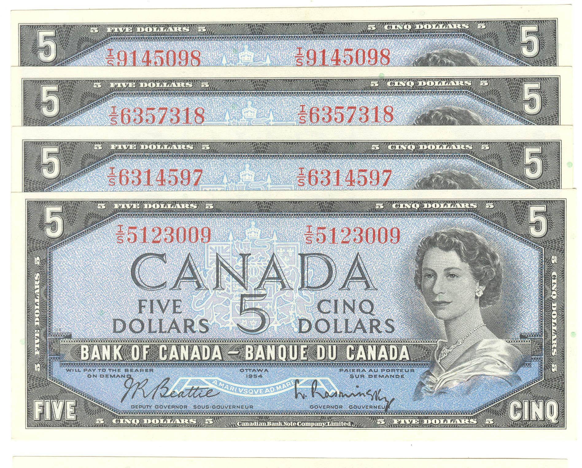 1954  Five Dollars Modified, BC-39b, 4 UNC, Beattie Rasminsky, serial I/S5123009, I/S6314597, I/S6357318, I/S9145098.