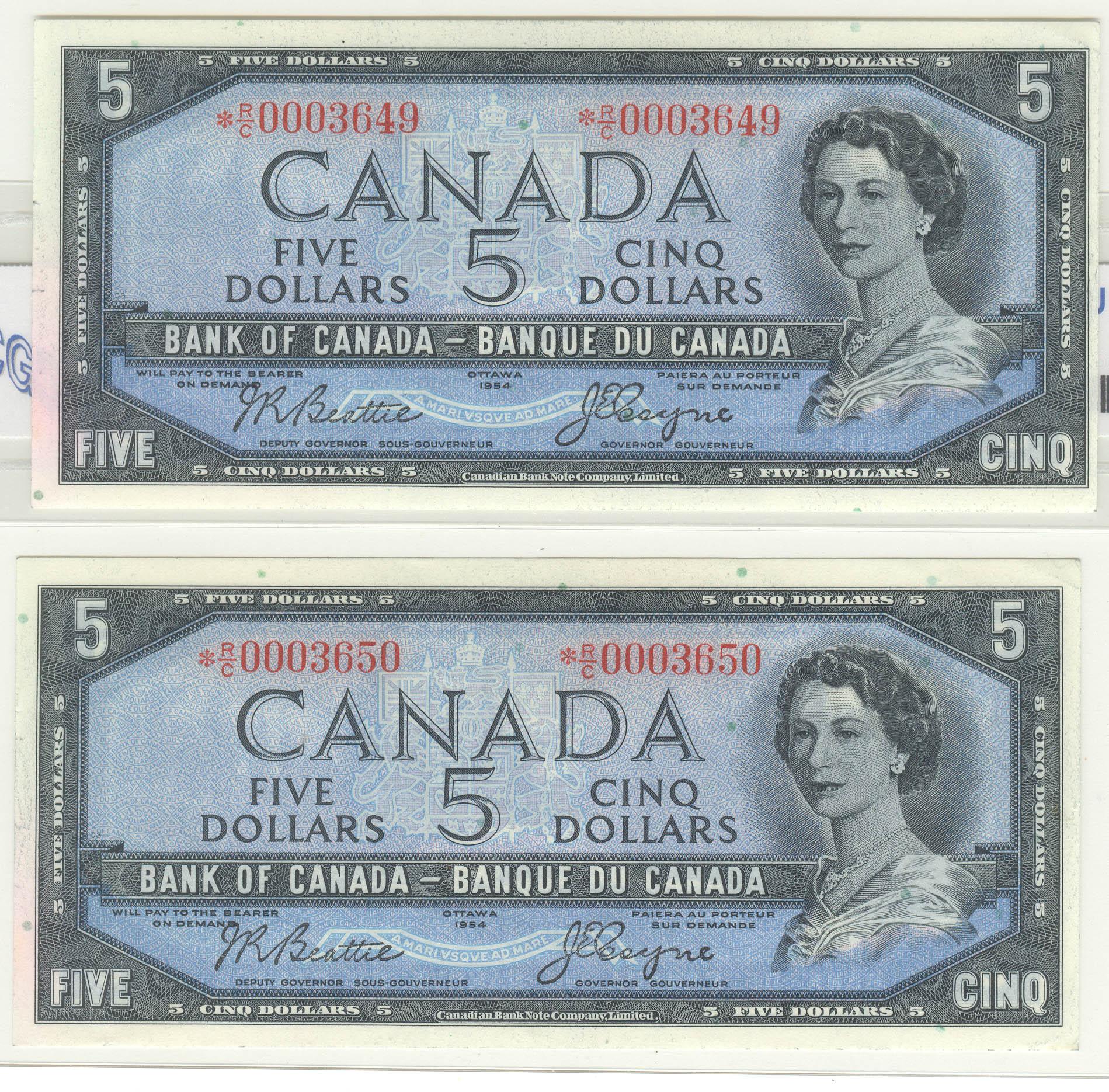 1954 Five Dollars Replacement Modified, BC-39aA-i, 2 Consecutive CCGS AU-50, Beattie Coyne, serial *R/C0003649-50.
