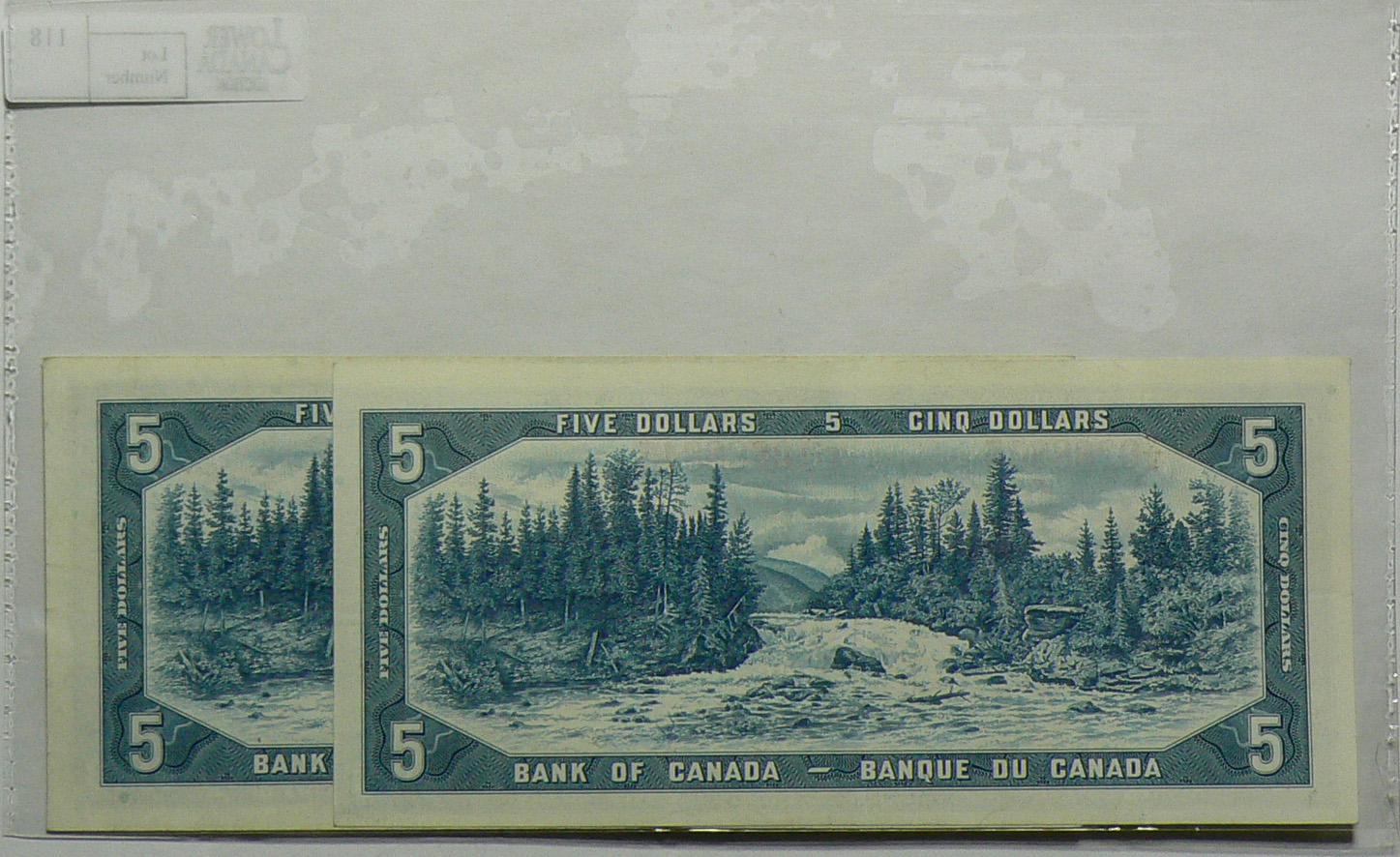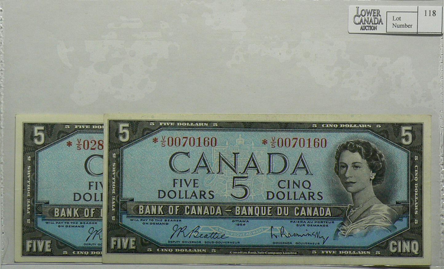 1954 Five Dollars Replacement Modified, BC-39bA, EF, Beattie Rasminsky, serial *V/S0070160 & *V/S0288845. Lot of 2 notes.