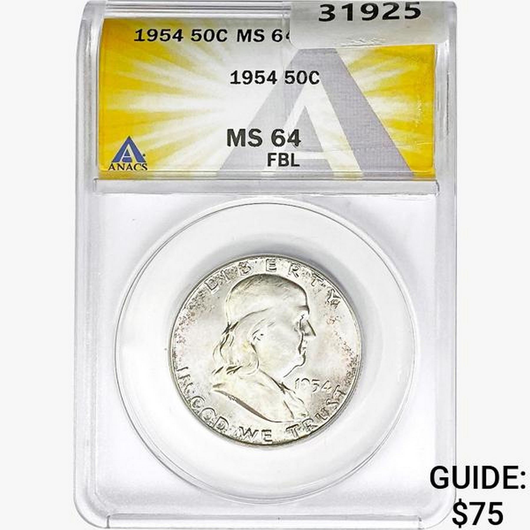 1954 Franklin Half Dollar ANACS MS64 FBL