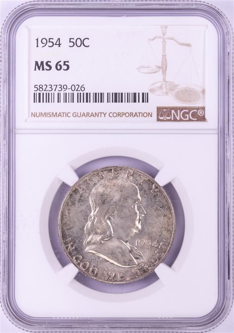 One 1954 Franklin Half Dollar Coin NGC MS65. NGC Certified.