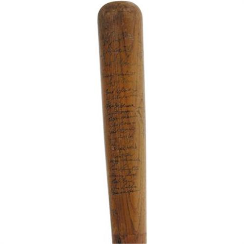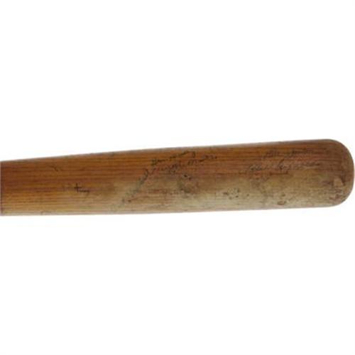 <B>1954 Hall of Famers Multi-Signed Bat.</B></I> Astounding assortment of autographs was collected on a full-size store model Hillerich & Bradsby by a fan in attendance at Yankee Stadium's Hall of Fame game on August 14, 1954, as his vintage ink notation attests. While a few "mere mortals" are sprinkled in among the greats of the game, the cast of characters is definitely heavily slanted toward Cooperstown quality: Paul Waner, Gabby Hartnett, Dazzy Vance, Fred Clarke, Whitey Ford, Lefty Grove, Joe DiMaggio, Phil Rizzuto, Enos Slaughter and a great "rookie style" Mickey Mantle. It must be pointed out that in addition to the twenty-six genuine autographs decorating the barrel of the bat, the youthful original owner chose to augment the cast of legends with the names of close to a dozen other Hall of Famers. These "autographs" remain well hidden from view when the bat is displayed however, as they are almost all applied to the opposite side of the barrel. The genuine signatures have survived surprisingly well compared to most signed bats from this era, with none listed dipping below a boldness of 7/10. The bat itself shows expected wear, but thankfully any imperfections have very limited effect upon the autographs. <I>LOA from PSA/DNA. LOA from James Spence Authentication.</B></I><BR><BR><b>Shipping:</b> Bats, Clubs, Sticks, Swords, Rif (<a target="_blank" href="http://www.heritageauctions.com/common/shipping.php">view shipping information</a>)