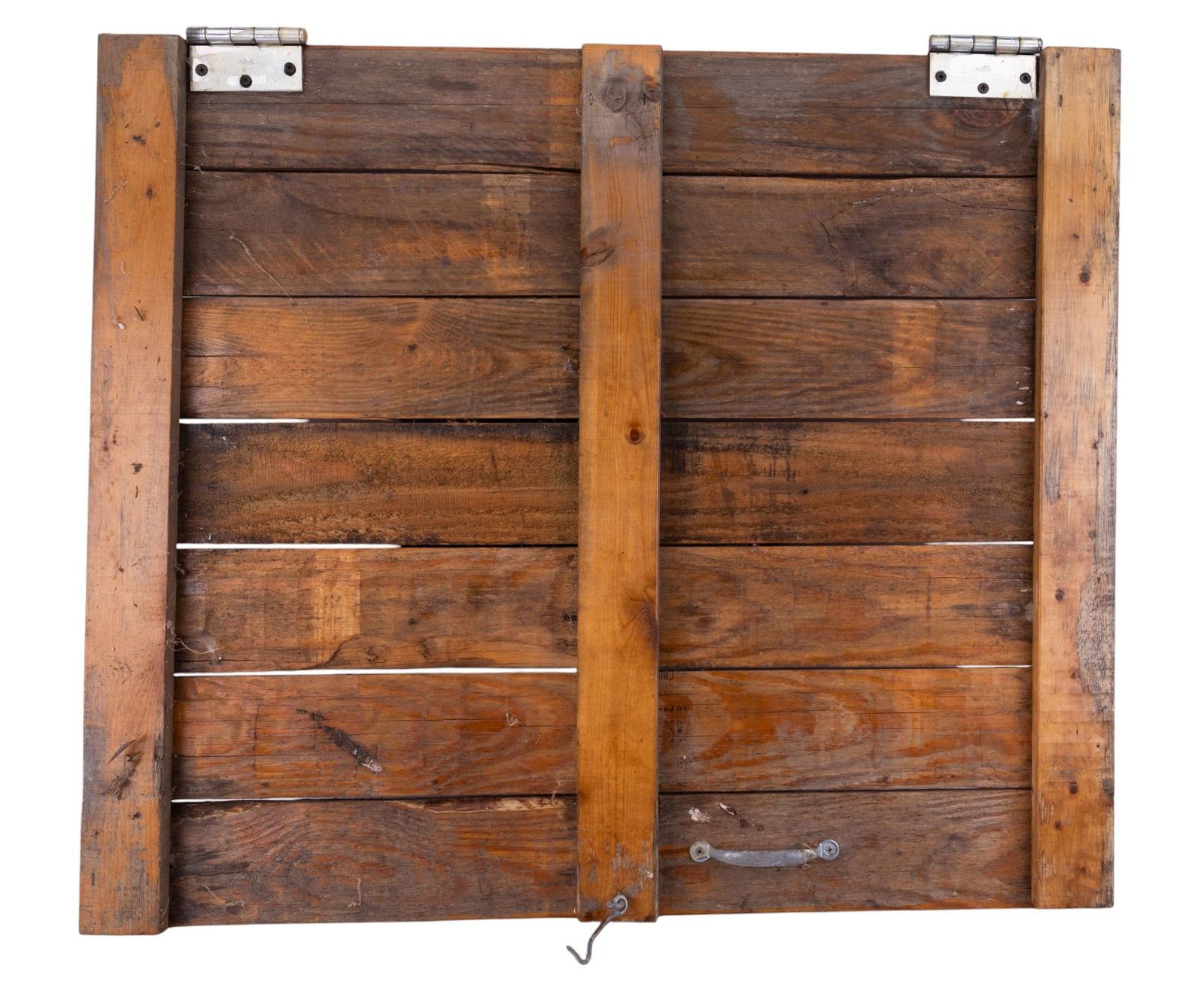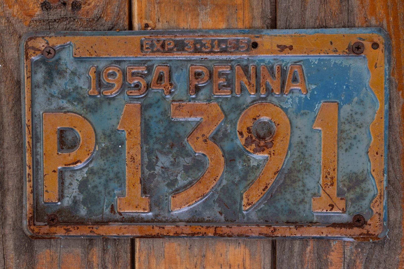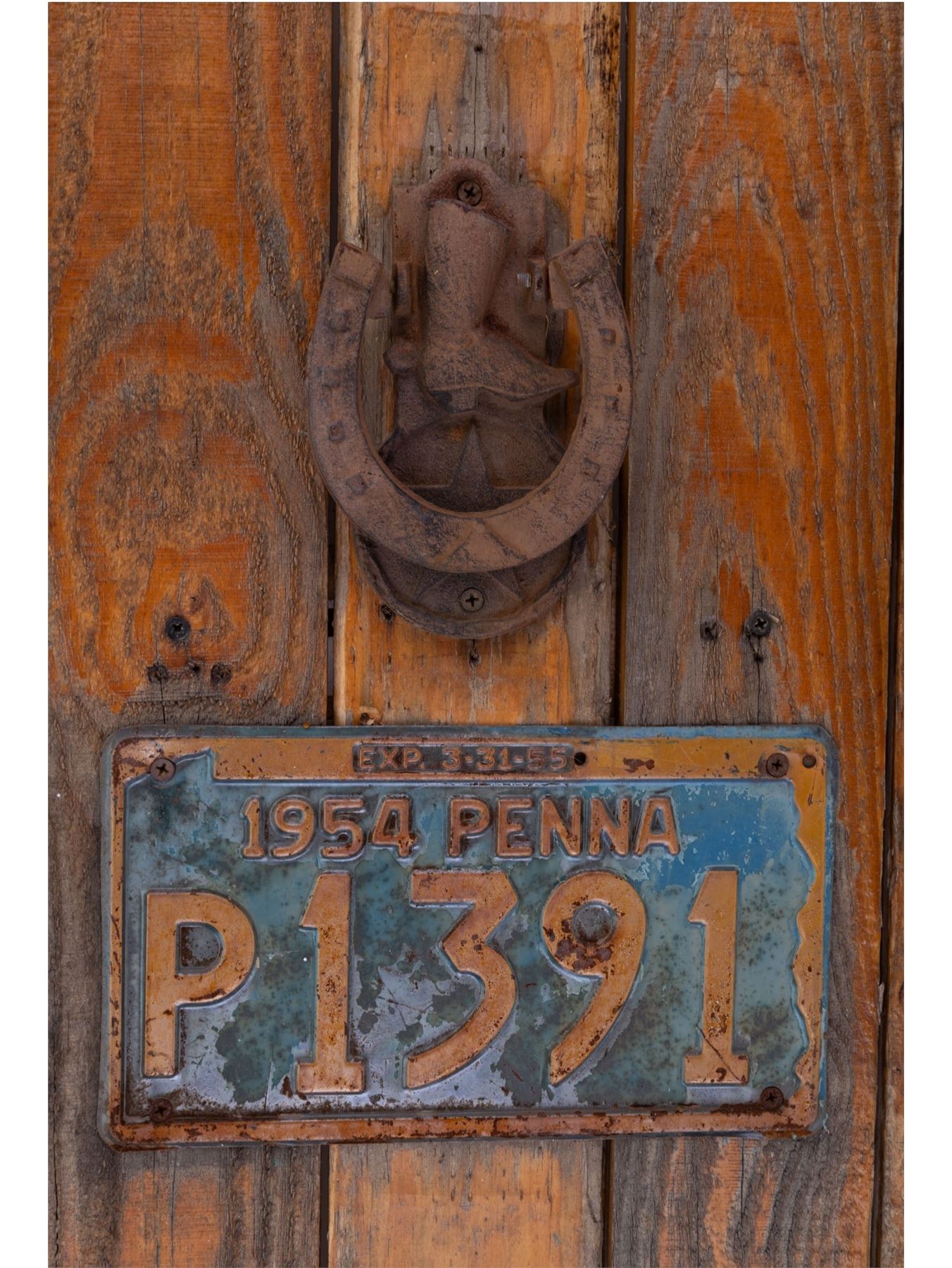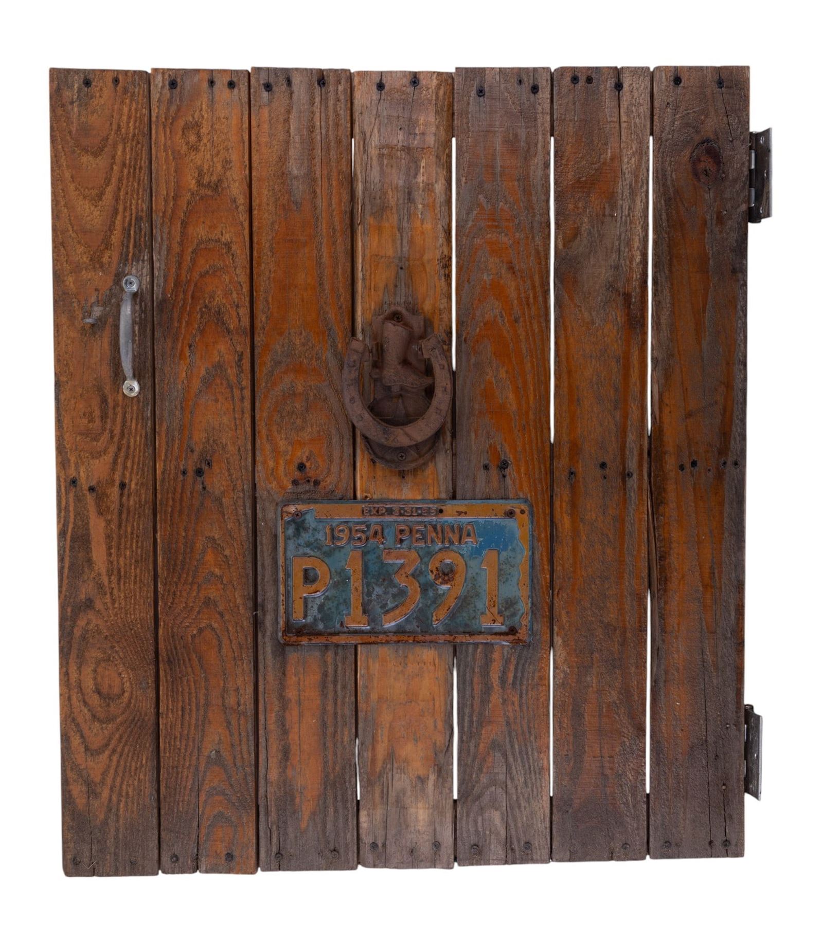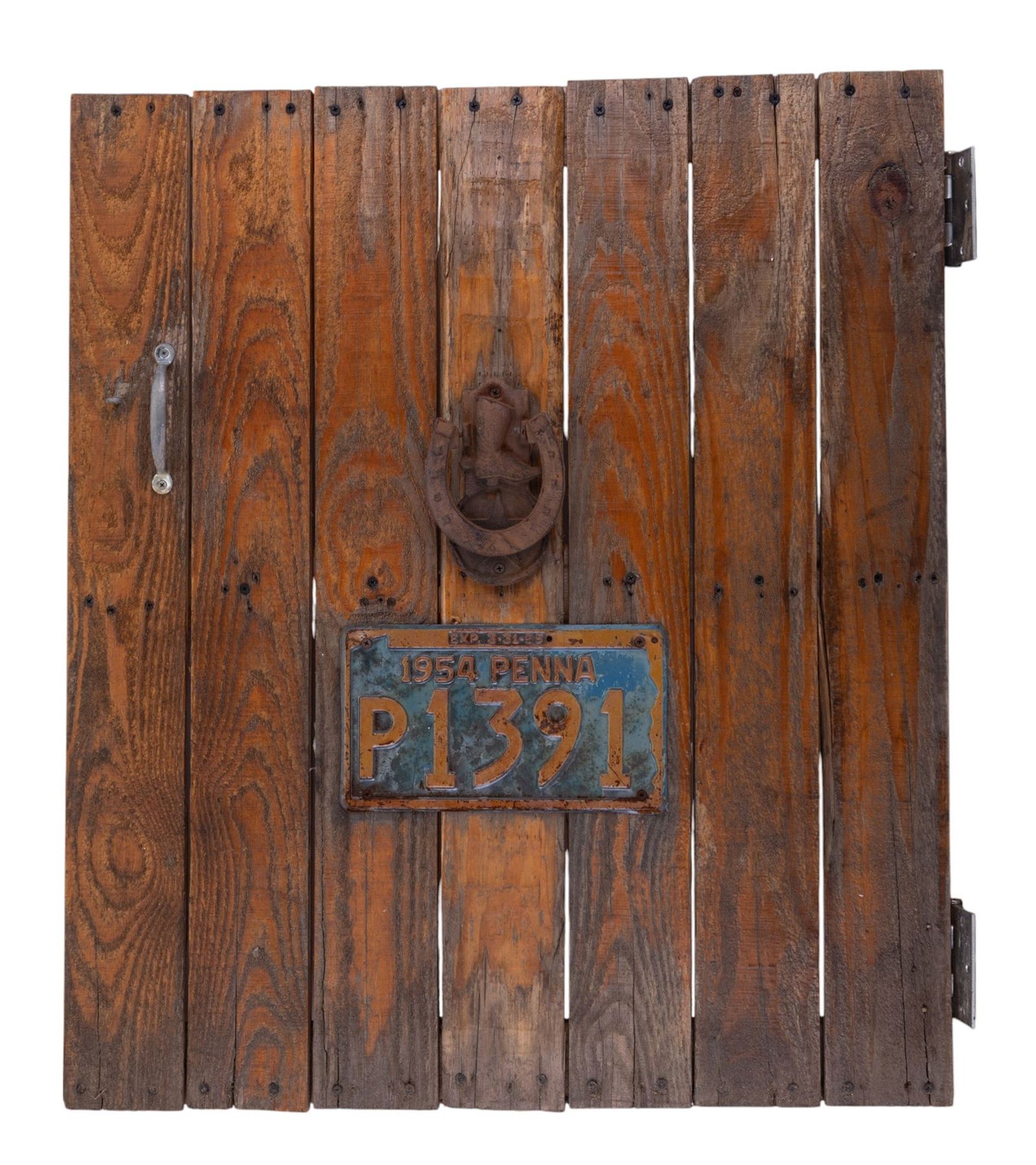 1954 Pennsylvania license plate & early door knocker on paneled door with hinges measuring 32.5" tall, 27.5" wide & 1.5" deep. Weighty.