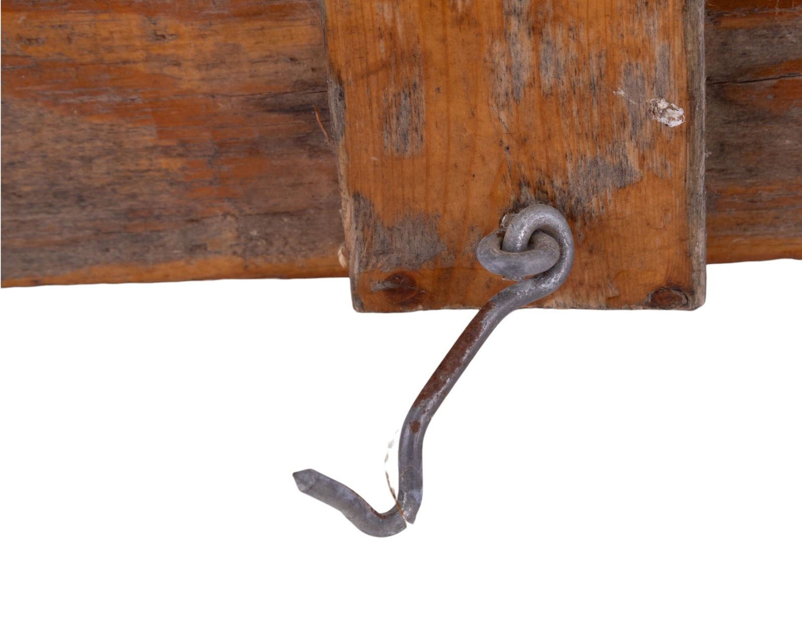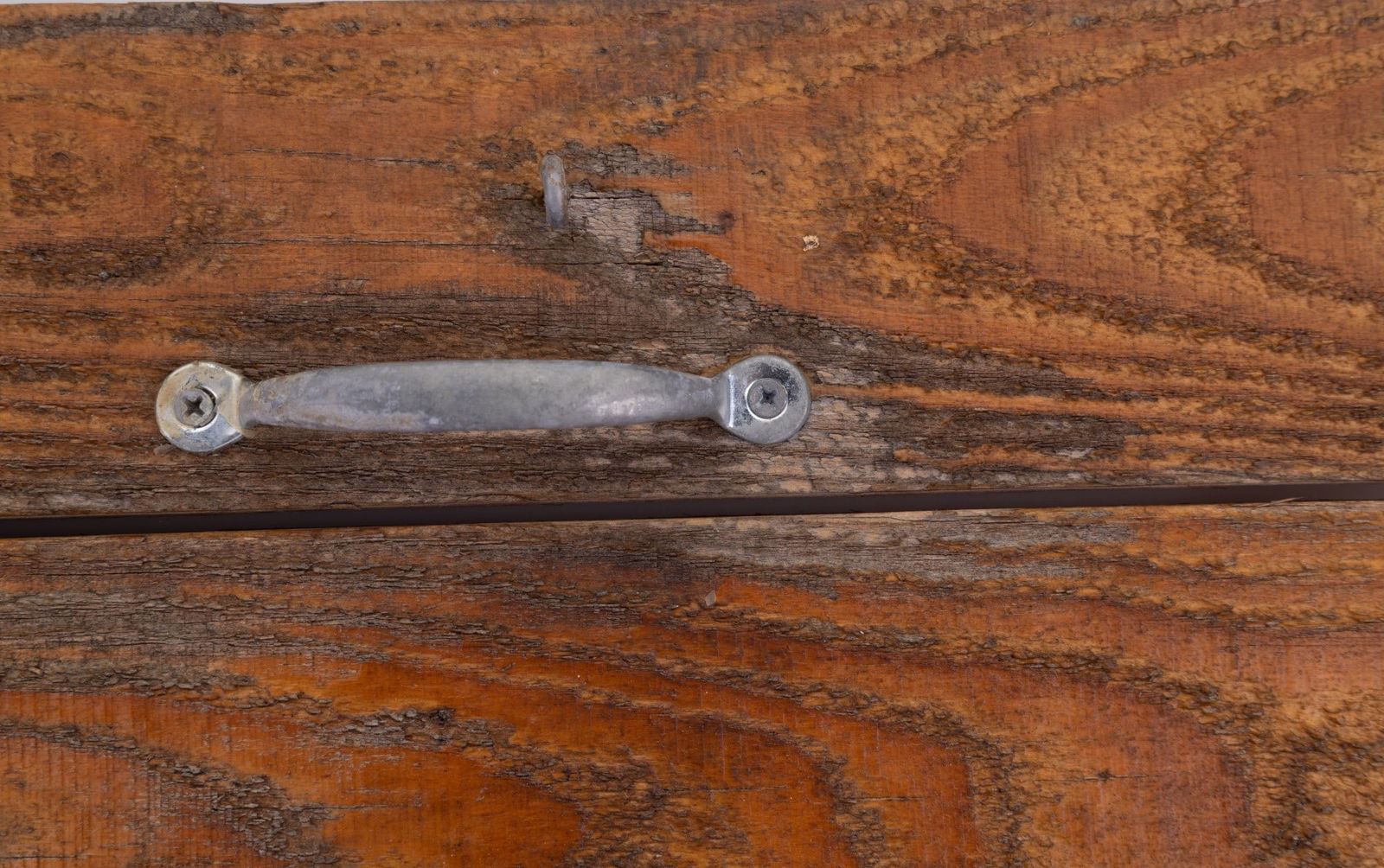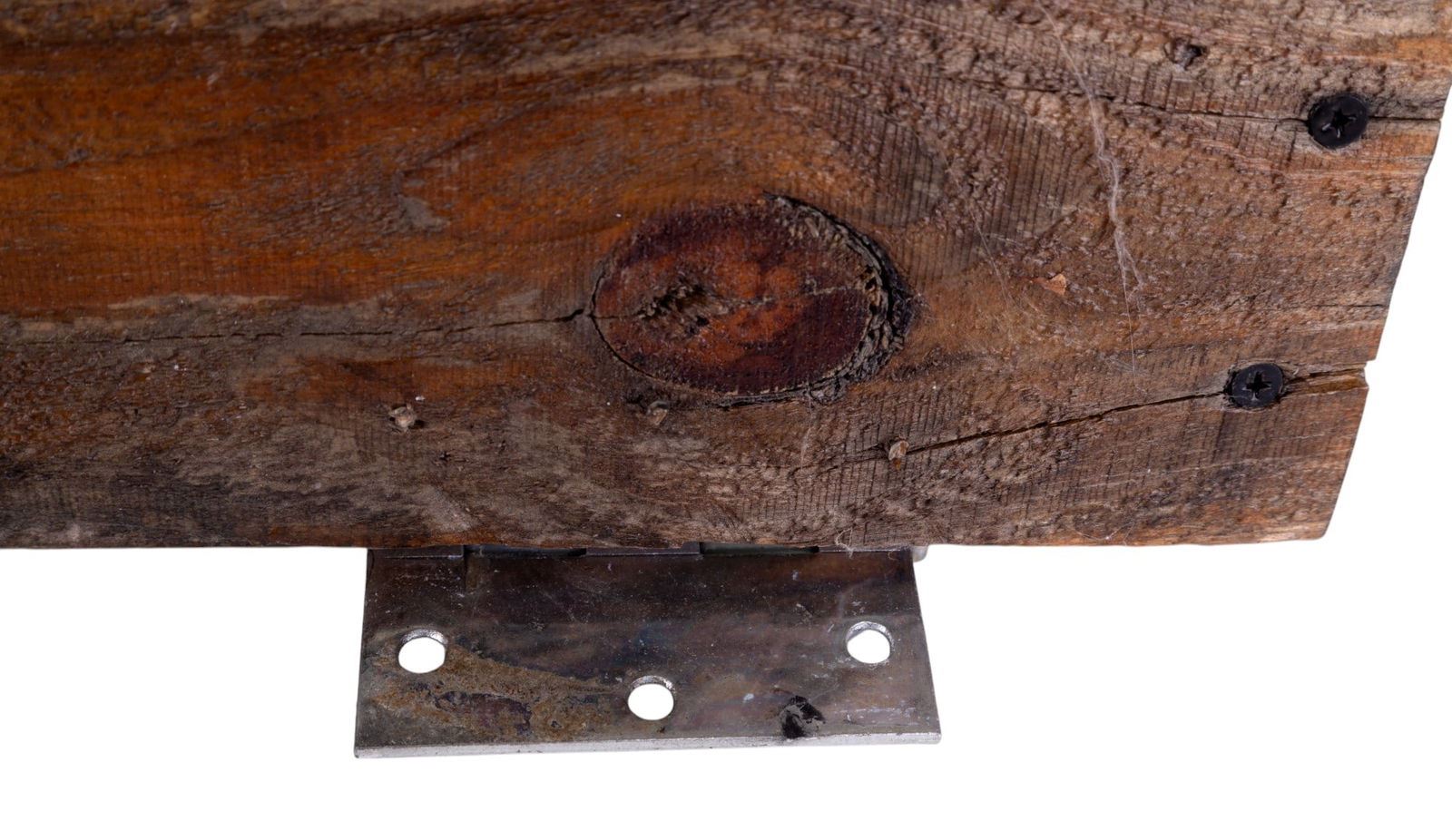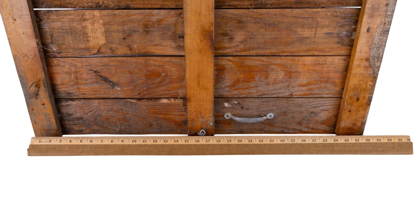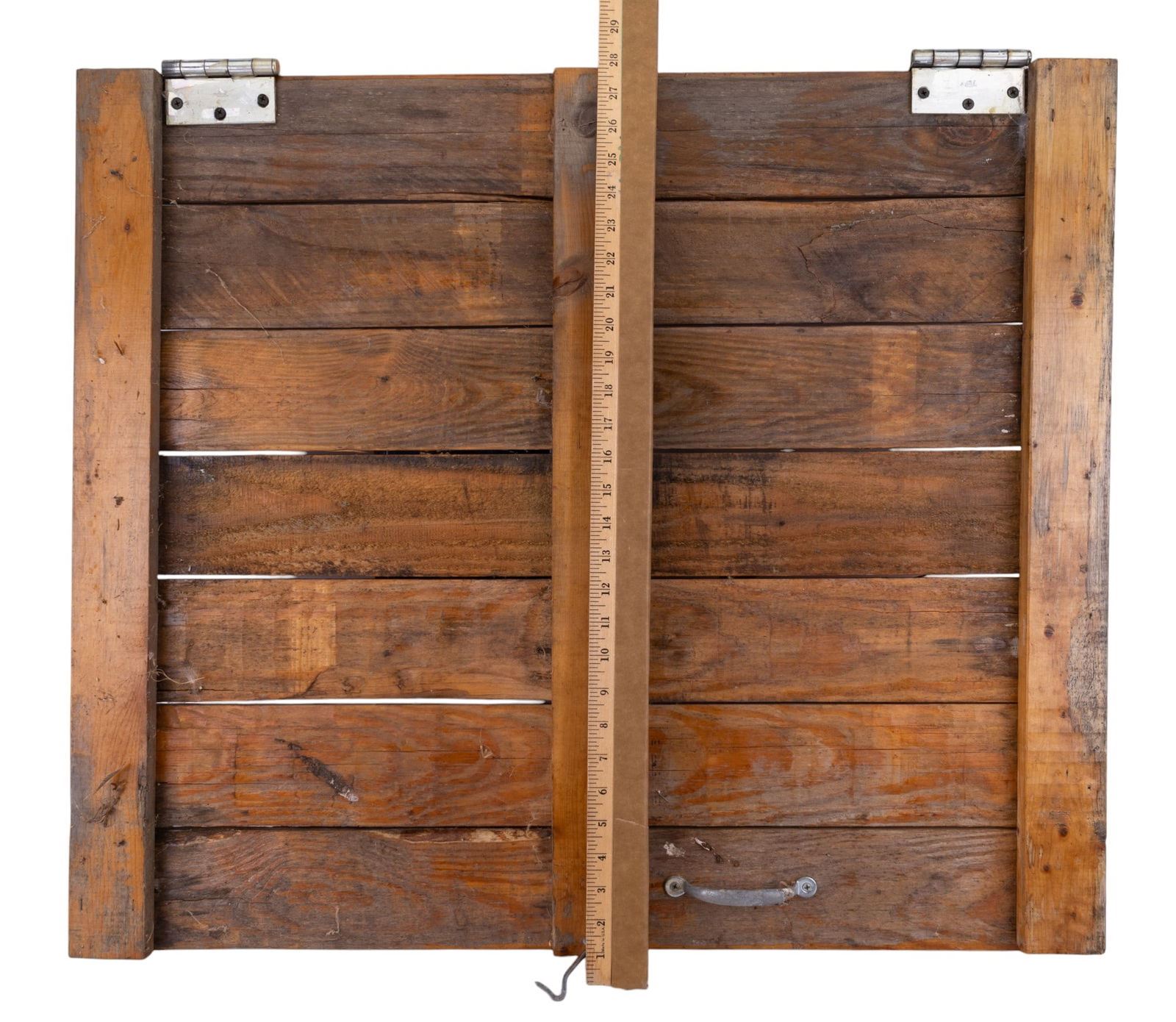 1954 Pennsylvania license plate & early door knocker on paneled door with hinges measuring 32.5" tall, 27.5" wide & 1.5" deep. Weighty.