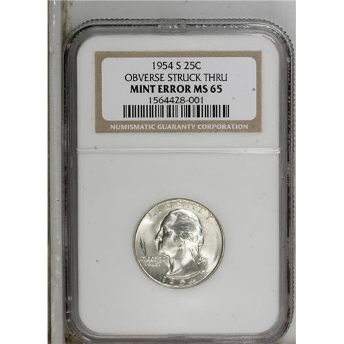 <B>1954-S 25C Quarter--Obverse Struck Thru--MS65 NGC.</B></I> NGC Census: (0/0). PCGS Population (0/0). (#5857)<BR><BR><b>Shipping:</b> Coins & Currency (<a target="_blank" href="http://www.heritageauctions.com/common/shipping.php">view shipping information</a>)