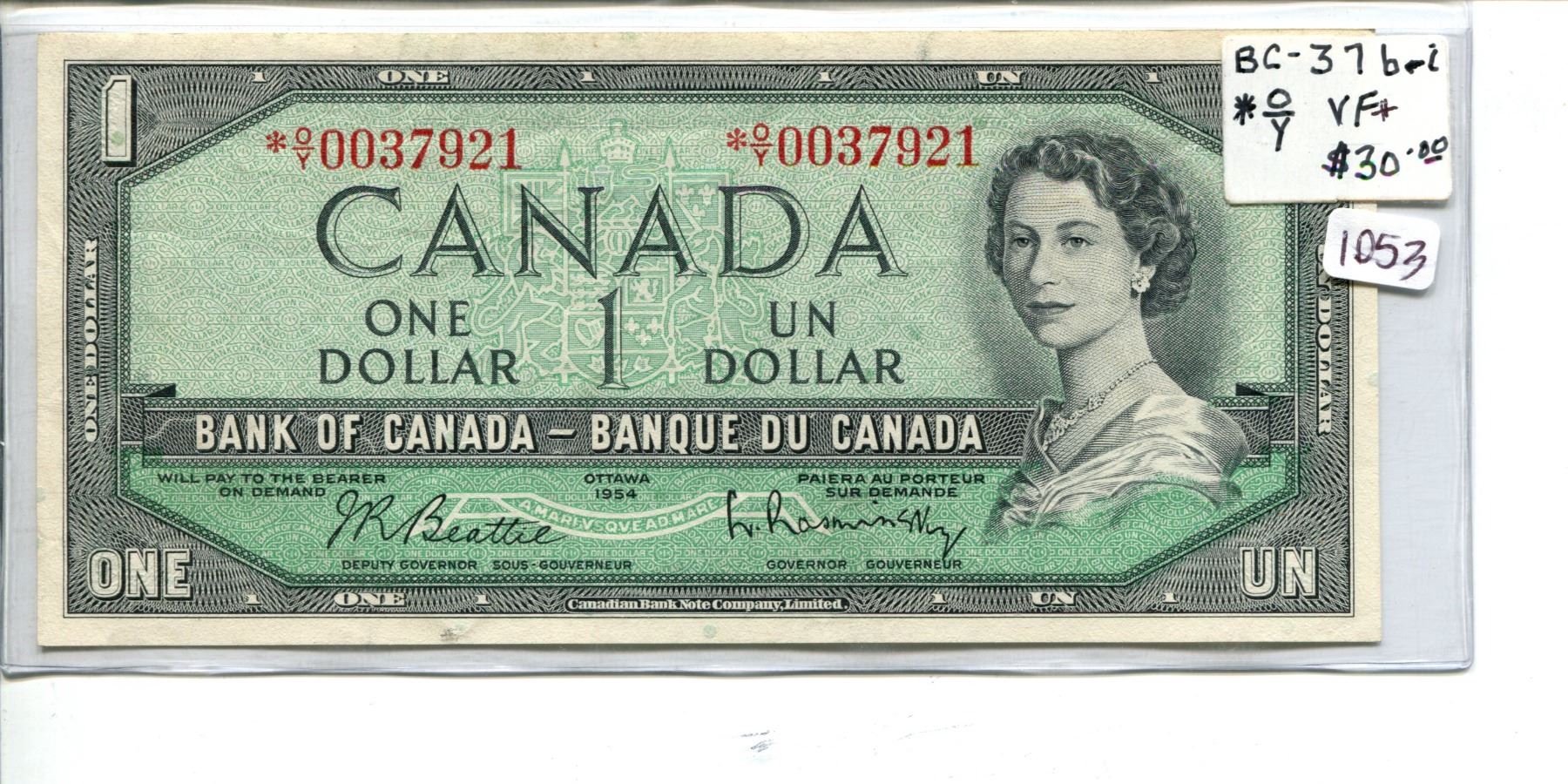 1954 Modified $1. Beattie-Rasminsky signatures. Asterisk Replacement Note. *O/Y Prefix. Serial Numbe
