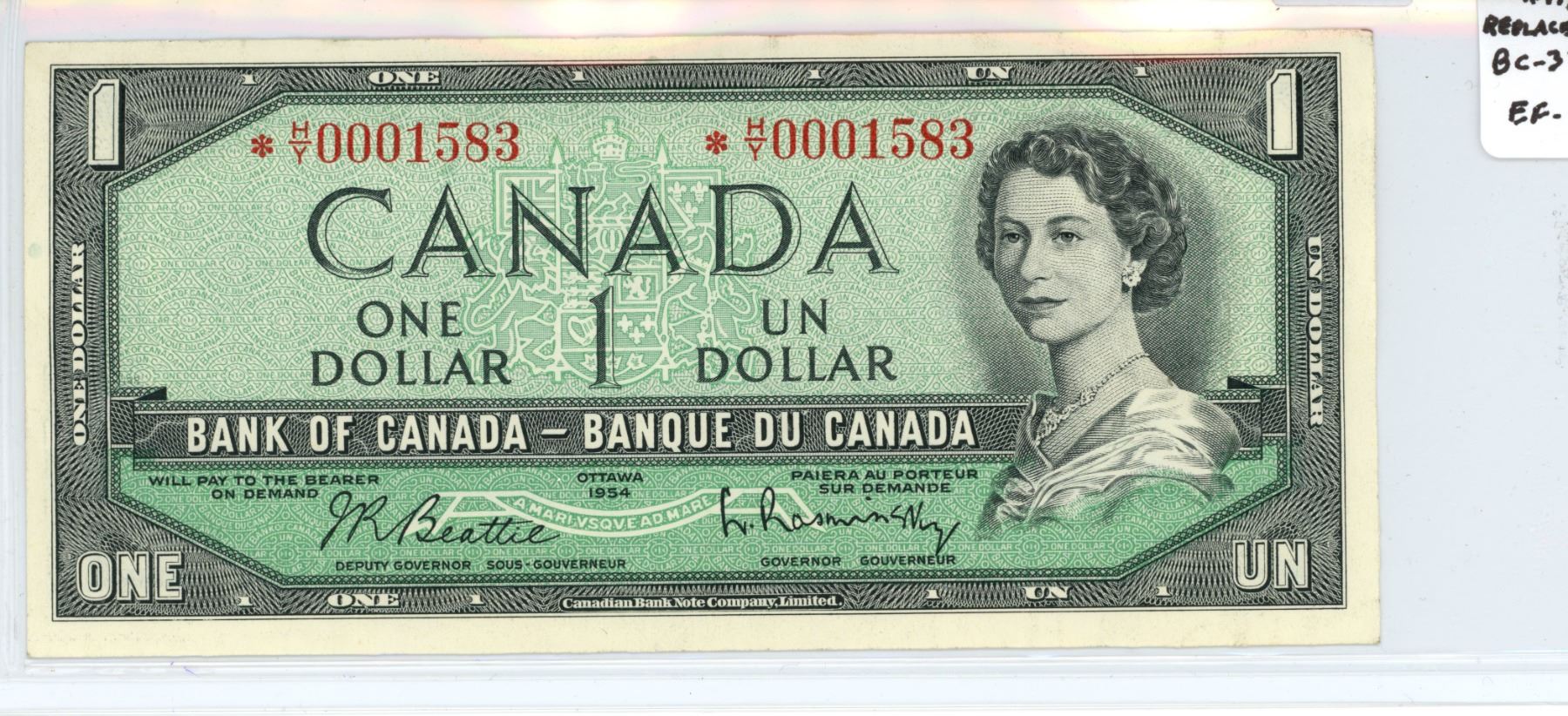 1954 Modified Portrait $1 Replacement. *H/Y Replacement Prefix. BC-37b. EF-40. Serial Number 0001583.