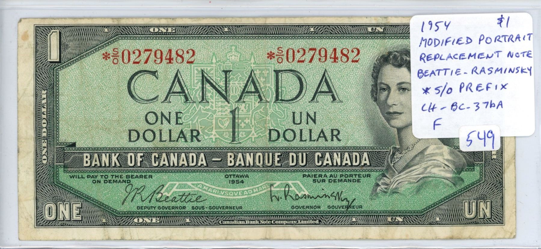 1954 Modified Portrait $1 Replacement Note. Beattie-Rasminsky signatures. *S/O Prefix. BC-37bA. F-12.
