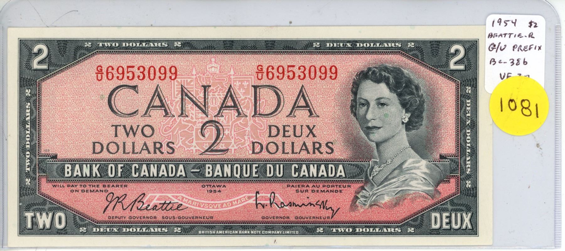 1954 Modified Portrait $2 note. Beattie-Rasminsky signatures. G/U Prefix. BC-38b. VF-30. Nice.