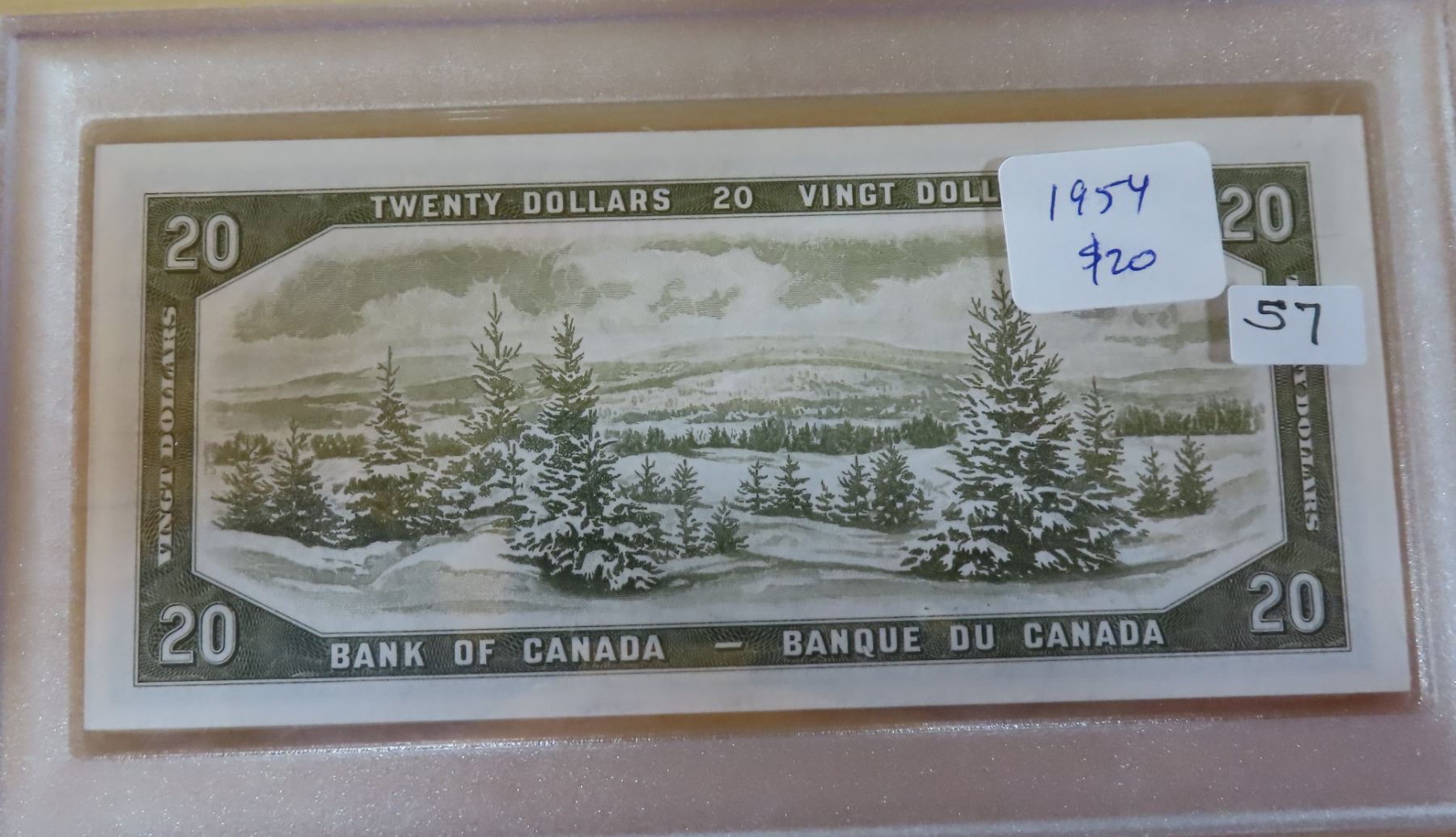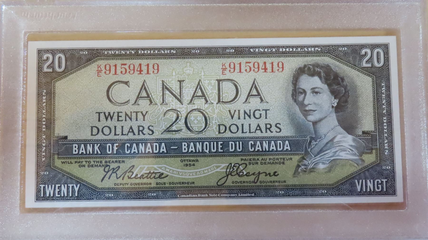 1954 Modified Portrait $20. Beattie-Coyne signatures. K/E Prefix. BC-41a. Uncirculated. Housed in a hard plastic holder.