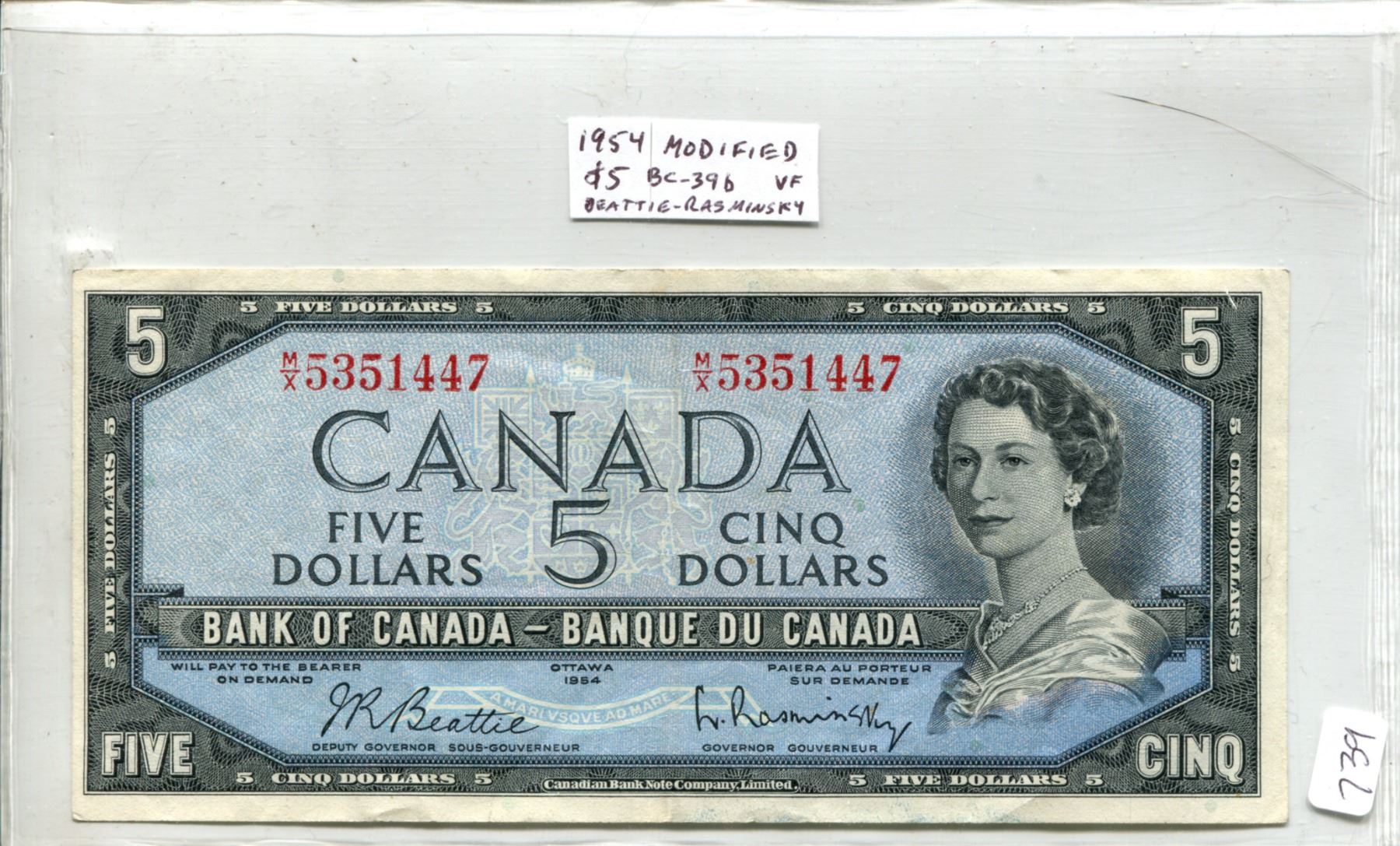 1954 Modified Portrait $5. Beattie-Rasminsky signatures. M/X Prefix. BC-39b. VF.