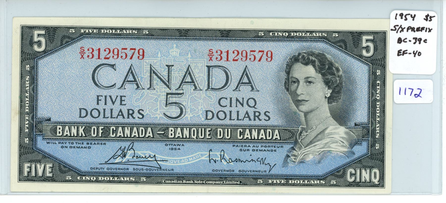 1954 Modified Portrait $5. Bouey-Rasminsky signatures. S/X Prefix. BC-39c. EF-40.