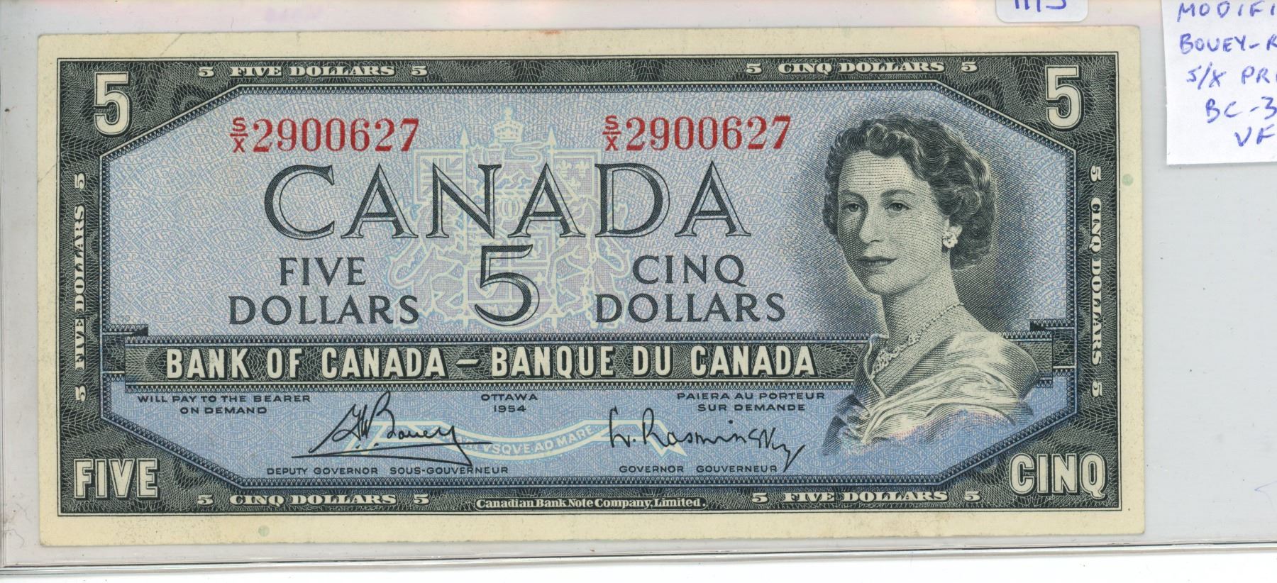 1954 Modified Portrait $5. Bouey-Rasminsky signatures. S/X Prefix. BC-39c. VF-20.