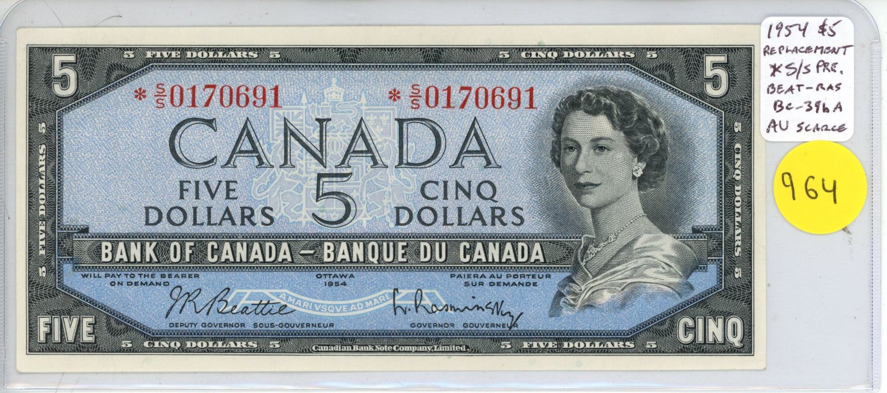 1954 Modified Portrait Replacement $5. Beattie-Rasminsky signatures. *S/S Replacement Prefix. BC-39bA. AU-50. Scarce.