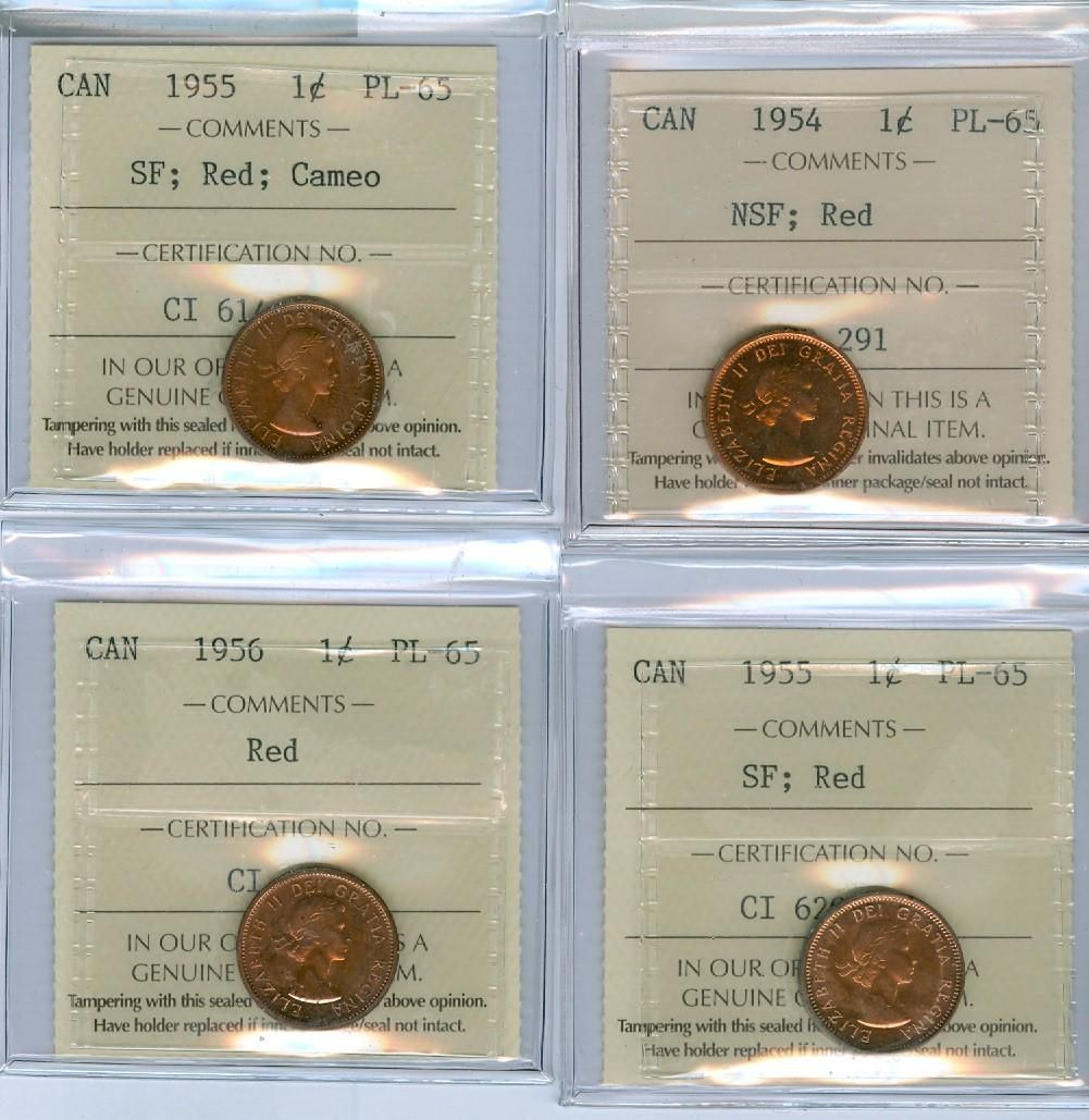 1954 NSF, 1955 SF(2) & 1956 1¢ ICCS PL65. Lot of 4 coins with one Cameo designation.