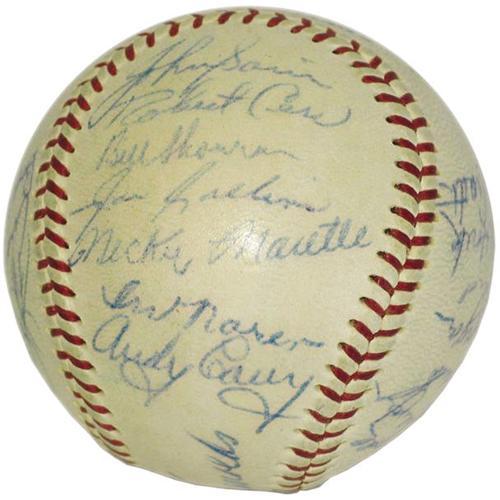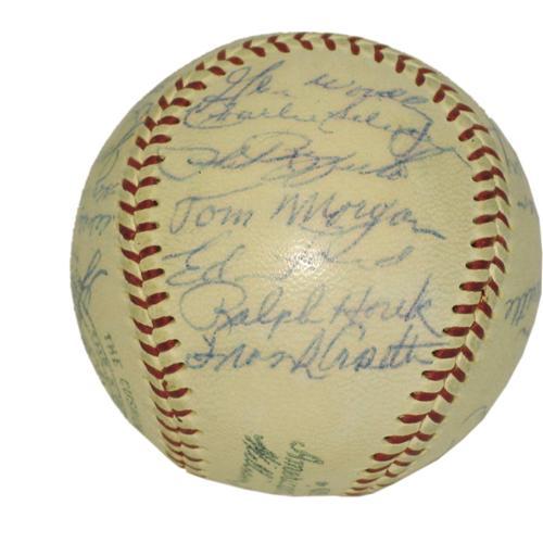 <B>1954 New York Yankees Team Signed Baseball</B></I>l Despite winning over 100 games during the regular season, the powerhouse Yanks couldn't wrest the pennant from the Cleveland Indians in one of the rare Octobers during the 1950's that saw the Bombers out of contention. Twenty-four blue ink signatures from this squad include the all-important Mantle, with Rizzuto, Ford, McDougald, Skowron, Sain and Slaughter nearby. Allie Reynolds is alone on the sweet spot. Signatures, including all mentioned, range from 6/10 to 8/10, with only two lesser names dropping a hair below. OAL (Harridge) ball is lightly and evenly toned. <I>LOA from PSA/DNA. LOA from James Spence Authentication.</B></I><BR><BR><b>Shipping:</b> Balls, etc. - Encased (<a target="_blank" href="http://www.heritageauctions.com/common/shipping.php">view shipping information</a>)