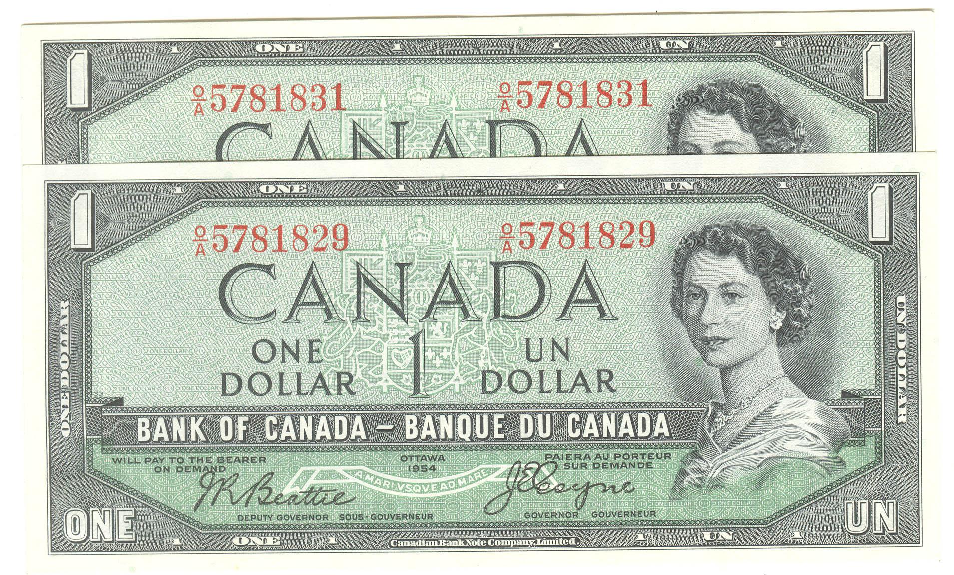 1954 One Dollar Pair of Devil's Face, BC-29b, UNC, Beattie Coyne, serial O/A5781829 & O/A5781831.