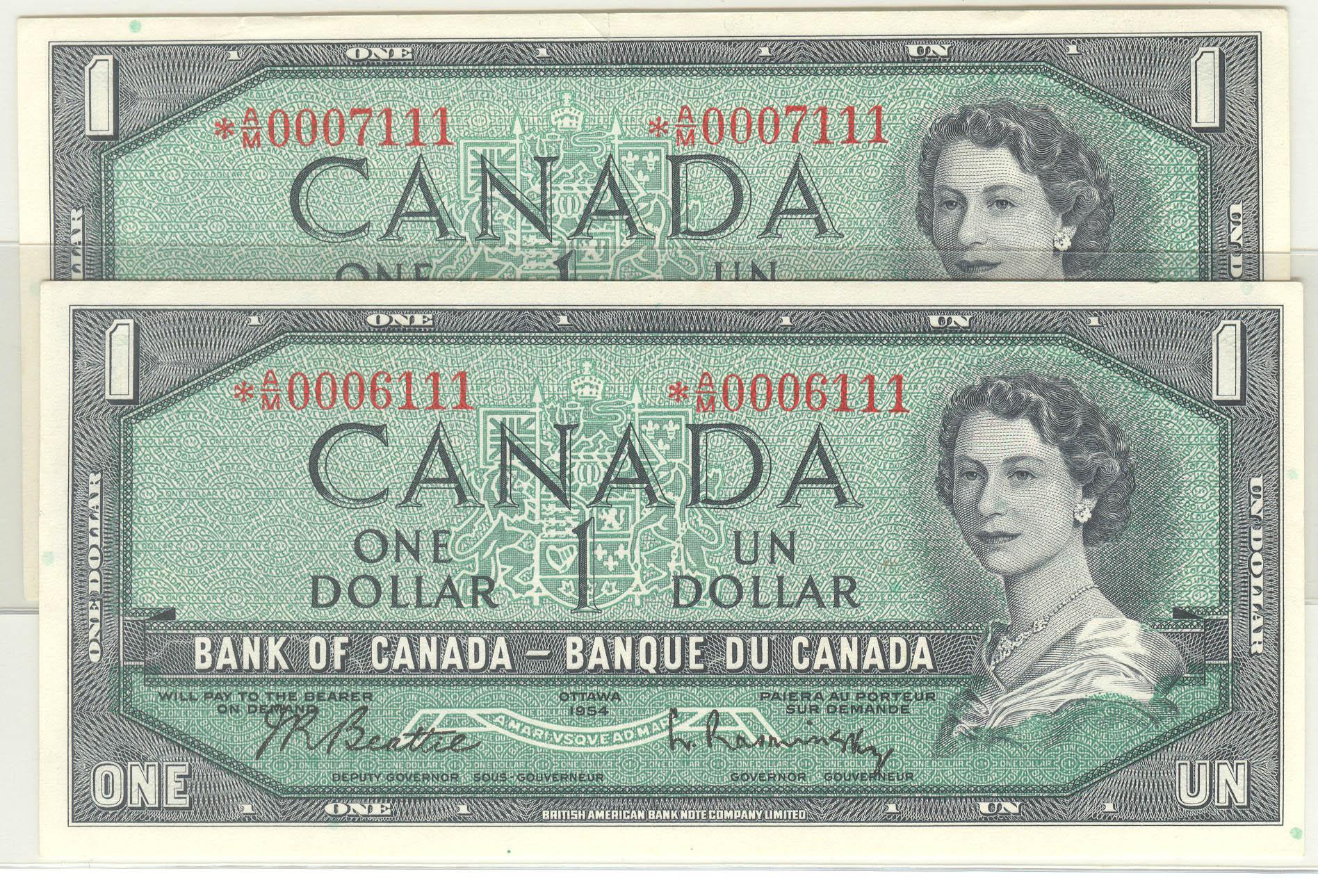 1954  One Dollar  Pair of Replacement  Modified, BC-37bA-i, AU, Beattie Rasminsky, serial *A/M0006111 & *A/M0007111.