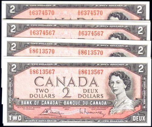 1954 Two Dollars Bouey-Rasminsky BC-38c four consecutive serial numbers A/G6374567-570 and four consecutive serial numbers C/G8613567-570. Total eight notes, all Uncirculated