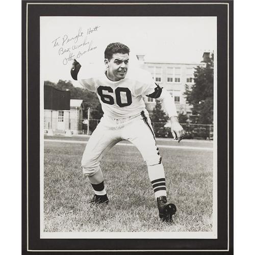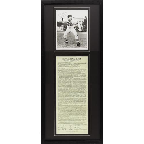 <B>1954 Otto Graham Signed Standard Players Contract.</B></I> This season was to be the Hall of Fame quarterback's last, but Graham responded to coach Paul Brown's pleas to return for the 1955 season after leading his Cleveland squad to a resounding fifty-six to ten win over the Detroit Lions in the 1954 NFL Championship game. One could certainly consider this second-to-last year to be Otto Graham's finest, and this contract is the document that secured his services for the sum of $22,500. Accepting the terms with 10/10 signatures are Graham and coach Paul Brown, each now enshrined at Canton, as well as league commissioner Bert Bell who brings the Hall of Fame total to three. The document measures 8x19.75" in size and presents marvelously with original mailing folds. It appears that the document has been affixed to the backing, but this is of little concern as the back of standard players contracts are blank. Matted and framed along with the contract is a great 8x10" photo of Graham which he inscribes, "To Dwight Hott, Best Wishes, Otto Graham" in 9/10 ink. The initial recipient of the photo is better known to the hobby as "Duke" Hott, the most noted football collector in the world. This fine display piece, housing one of the most important documents in Cleveland Browns history, is framed to final dimensions of 16x37". <I>LOA from PSA/DNA.</B></I> <BR><BR><B>Important notice:</B> Heritage usually auctions material at the rate of 200-250 lots per hour. On some occasions eBay Live bid software or the Internet may not be able to keep up with the pace of the auction. We recommend placing a realistic absentee bid now as insurance to avoid disappointment. Occasionally the auctioneer may eliminate or reject an eBay Live bid, and the auctioneer may also reopen a lot after the close of the eBay live bidding (usually because we missed an audience bid), and may reject your bid even if it shows you as the winning bidder. By bidding via eBay Live, you agree that Heritage may award the lot to another bidder at its sole discretion under the circumstances described above or any other reasonable circumstances. Since eBay bids are not shown to us until we open the lot on the floor, we treat those bids just like floor bids. In most cases the floor responds before the eBay bid is presented to us, due to Internet lag time, so for consistency we have made it a policy that floor bids are always considered first over tie eBay live bids. Also please note that all Heritage lots purchased through eBay Live carry a 22.5% Buyer's Premium. Please make sure you read the Terms and Conditions before you bid. This lot is being auctioned in conjunction with a live floor auction by Heritage Galleries & Auctioneers. All final auction and invoice information will be supplied by Heritage Galleries & Auctioneers, and all other information should be considered preliminary. Lot:19291 <BR><BR><B>Winning Notification and Billing:</B> After the FINAL session in this auction is complete, Heritage will send e-mail and snail mail invoices. This process normally takes several days. All final auction and invoice information will be supplied by Heritage Galleries & Auctioneers, and all other information should be considered preliminary. <BR><BR>This auction will be conducted on a live auction floor and over the Internet through eBay Live. If you choose to place an absentee bid, please take a moment to <font color='#0000ff'><u><a href='http://pages.ebay.com/liveauctions/help/before/laabsentee.html'>learn how eBay Live absentee bidding works</a></u></font><font color='#000000'>
