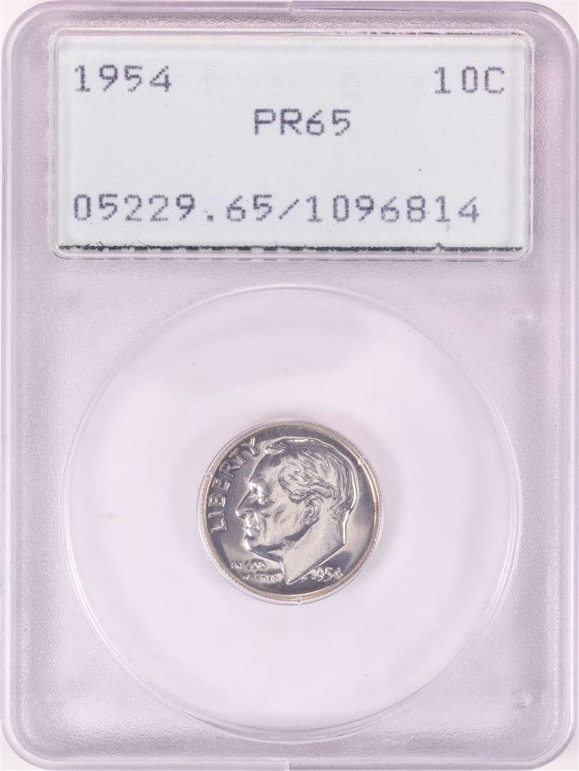 One 1954 Proof Roosevelt Dime Coin PCGS PR65 Green Rattler Holder. PCGS Graded.