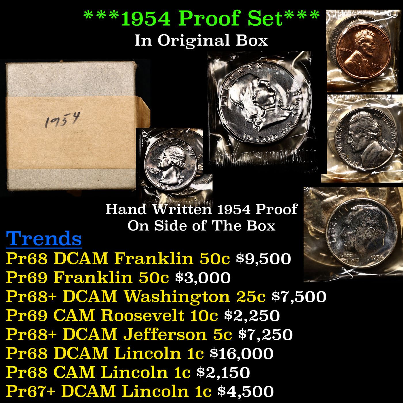 1954 Proof Set In Original Box. This proof set is in the original mint packaging with the original box. This set contains a proof Silver Franklin half Trends pr68 DCAM $21,000, pr69 CAM $5,350, pr69 $4,500, pr65 DCAM $685, a Proof Silver Washington quarter pr69 $450, pr69 cam $950, pr69 DCAM $4,500, the proof Silver Roosevelt dime pr69 $425, pr69 CAM $1,750 pr68 DCAM $5,500 + the proof nickel pr69 $275, pr69 CAM $700, pr68 DCAM $3,000, and the proof penny pr69 $,1,450, pr68 CAM $2,400 PR68 DCAM $15000. All coins in the original packaging