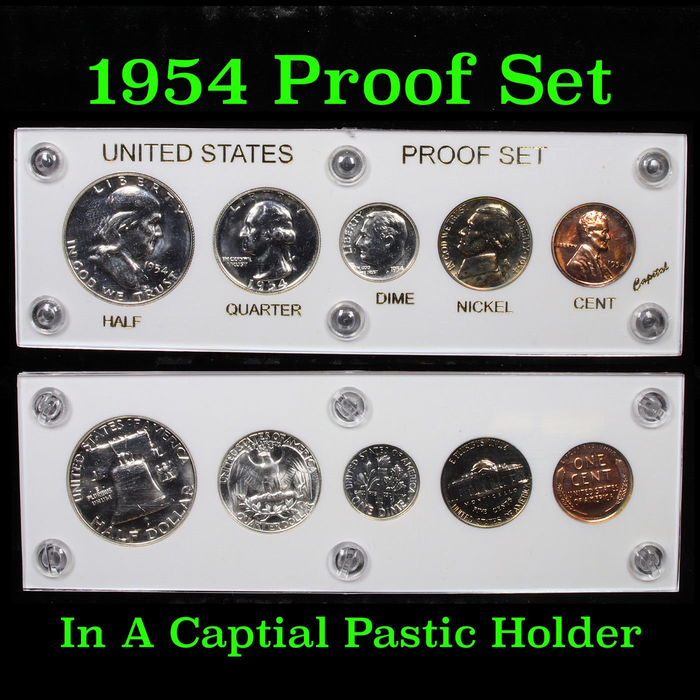1954 Proof Set in Capital Plastic Holder. This set is in a Capital Plastic Holder and has a 90% Proof Silver Franklin Half Dollar, a 90% Proof Silver Quarter, a 90% Proof Silver Dime, 2 Other Proof Coins. All 5 coins grade PR65+ or better. Estimated Value $150 for PR63