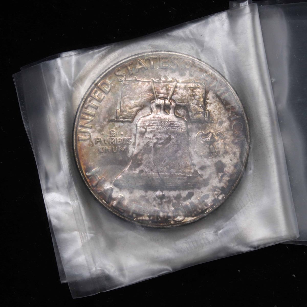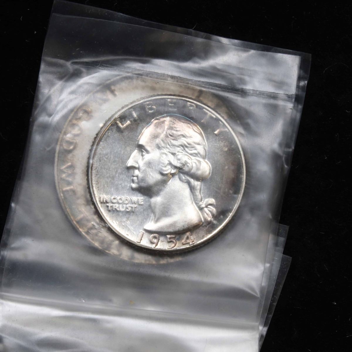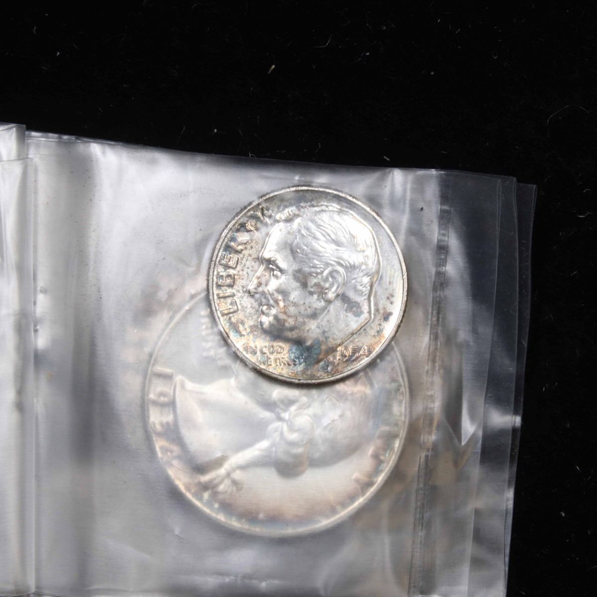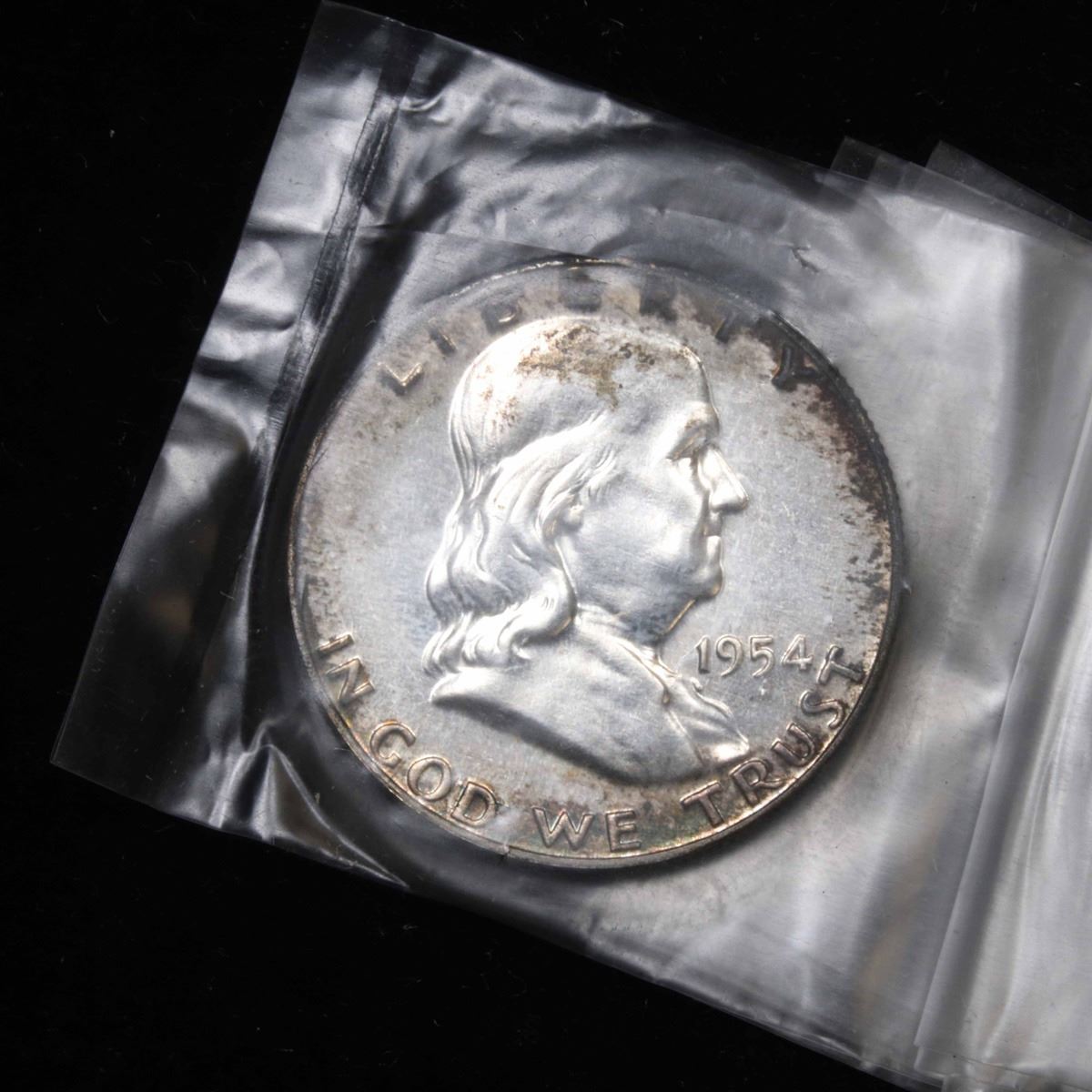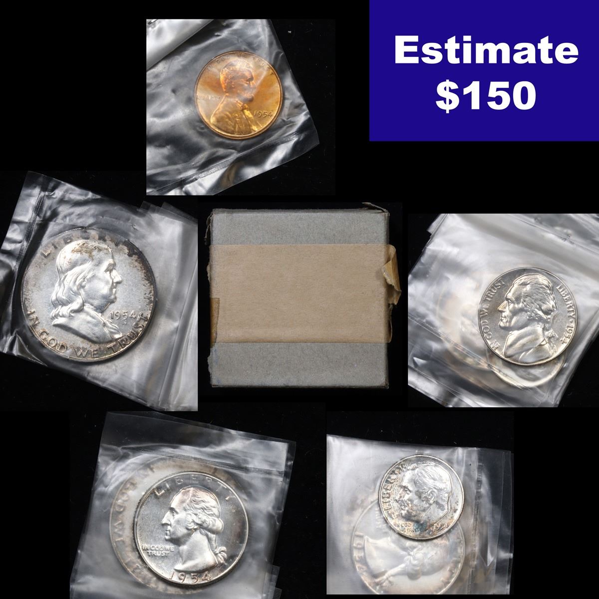 1954 Proof Set "in the original box" . This proof set is in the original mint packaging with the original box. This set contains a proof Silver Franklin half, a Proof Silver Washington quarter, the proof Silver Roosevelt dime + the proof nickel and the proof penny. All coins in the original packaging.