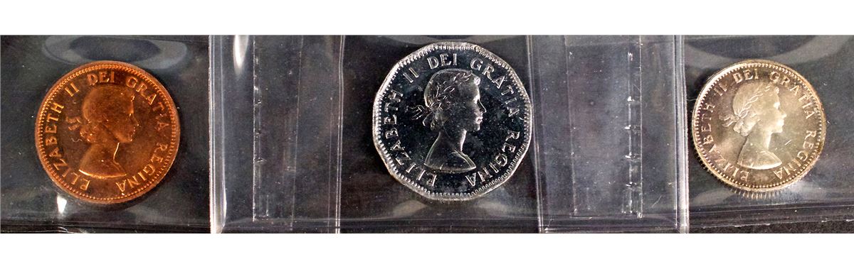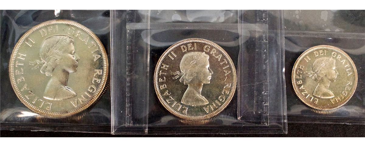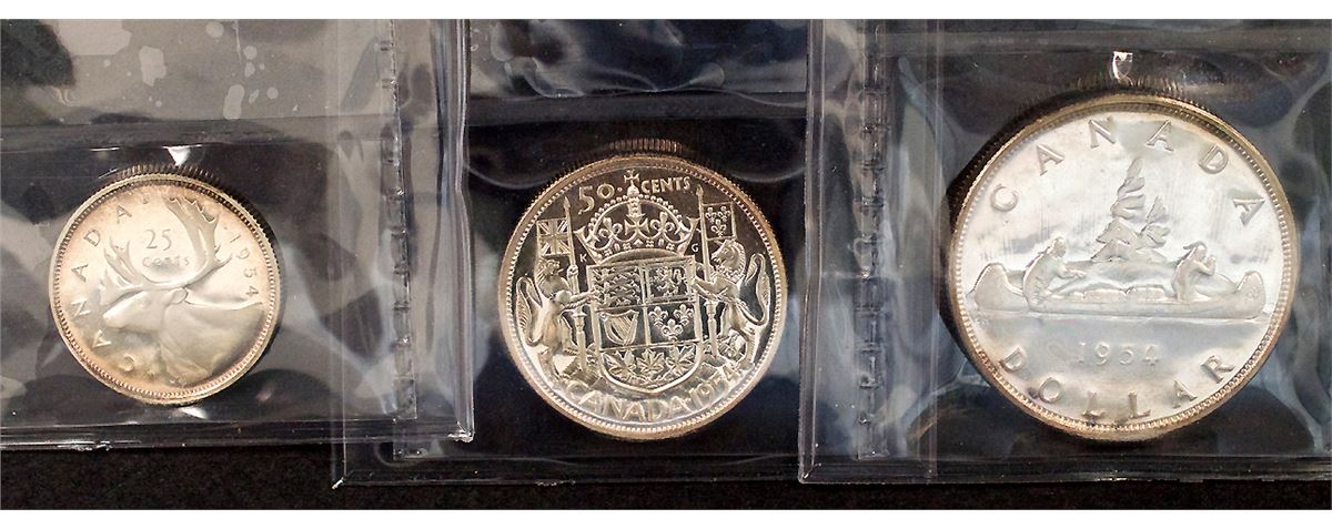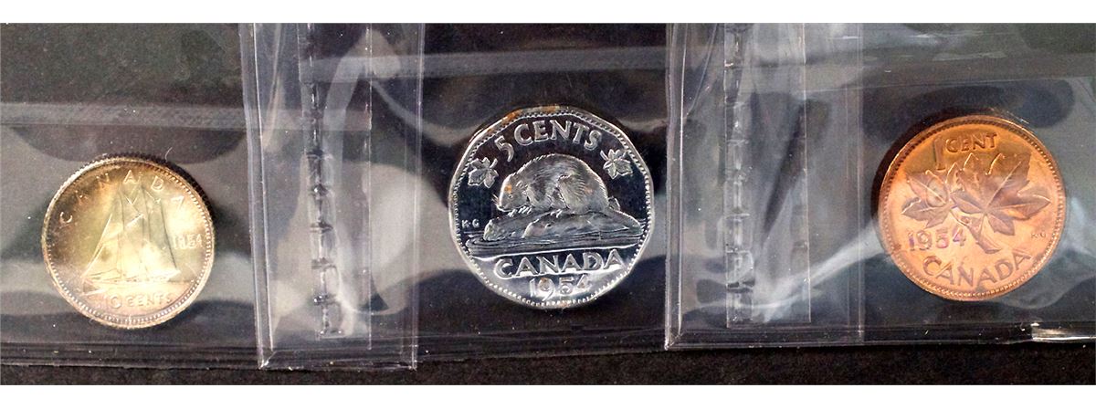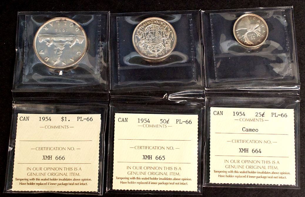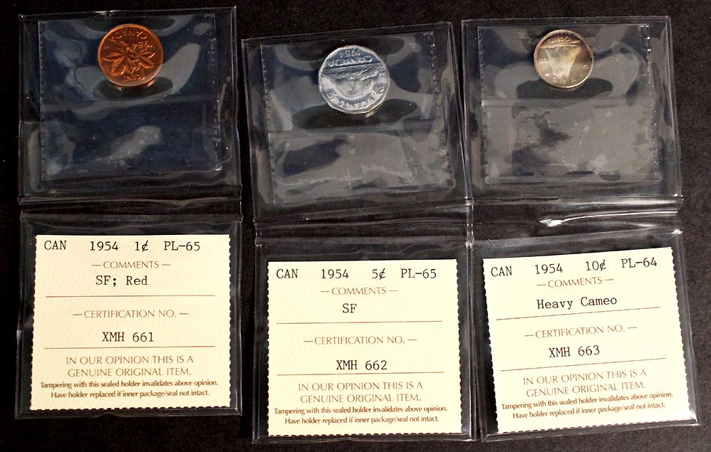 Prooflike Set, 1954, with all coins graded by ICCS: Cent, SF, PL-65, Red; 5 Cents, PL-65; 10 Cents, PL-64, Heavy Cameo; 25 Cents, PL-66, Cameo; 50 Cents, PL-66; $1, PL-66; Silver is white, with a hint of colour on some. A nice set.