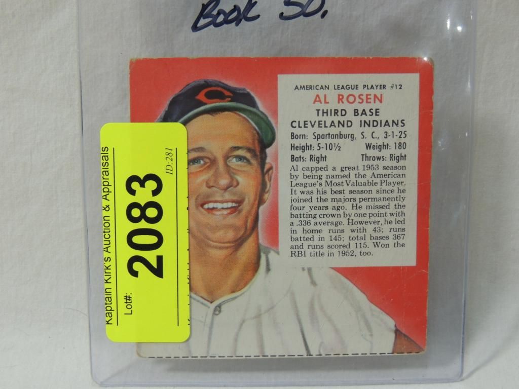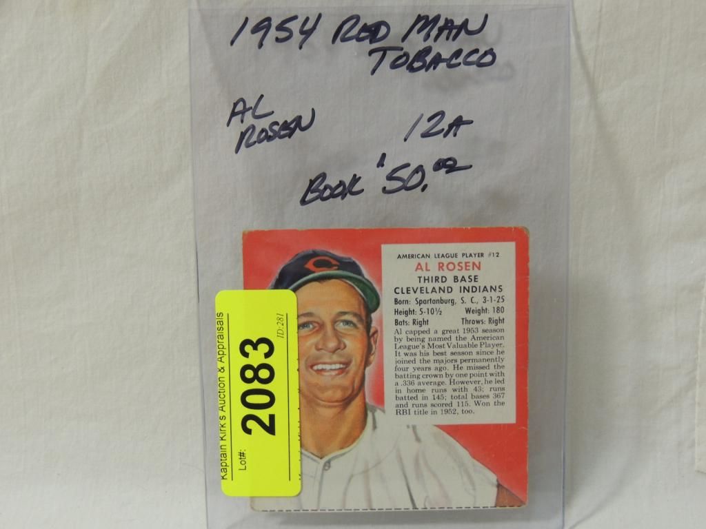 1954RED MAN TOBACCO AL ROSEN 12A BASEBALL CARD. BASEBALL COLLECTIBLE. VINTAGE CARD. GOOD CONDITION. IN PLASTIC SLEEVE. AS SHOWN. SEE PHOTO FOR MORE DETAILS.
