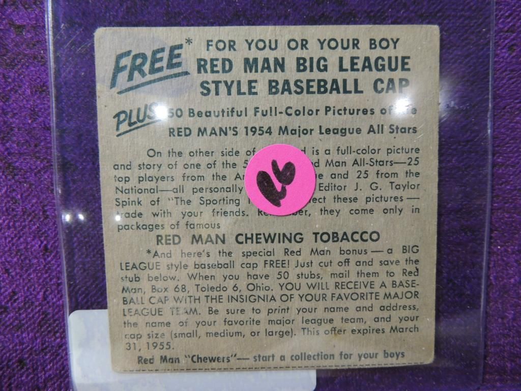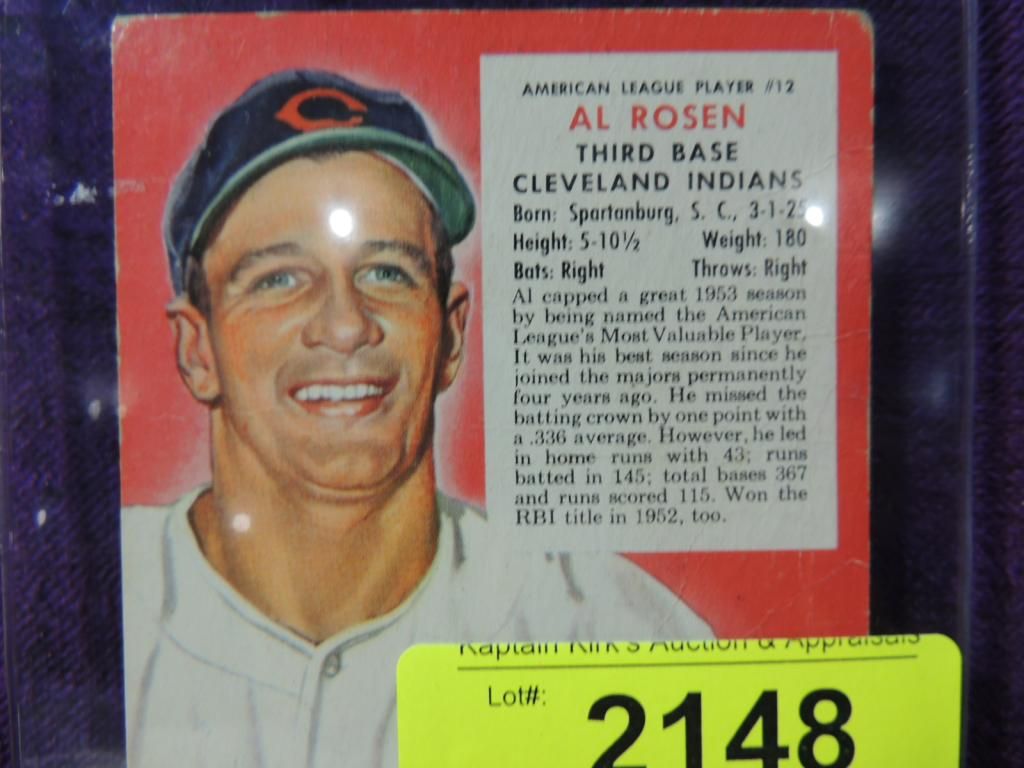 1954RED MAN TOBACCO AL ROSEN 12A BASEBALL CARD. BASEBALL COLLECTIBLE. VINTAGE CARD. GOOD CONDITION. IN PLASTIC SLEEVE. AS SHOWN. SEE PHOTO FOR MORE DETAILS.