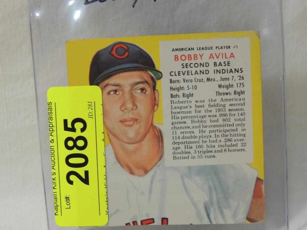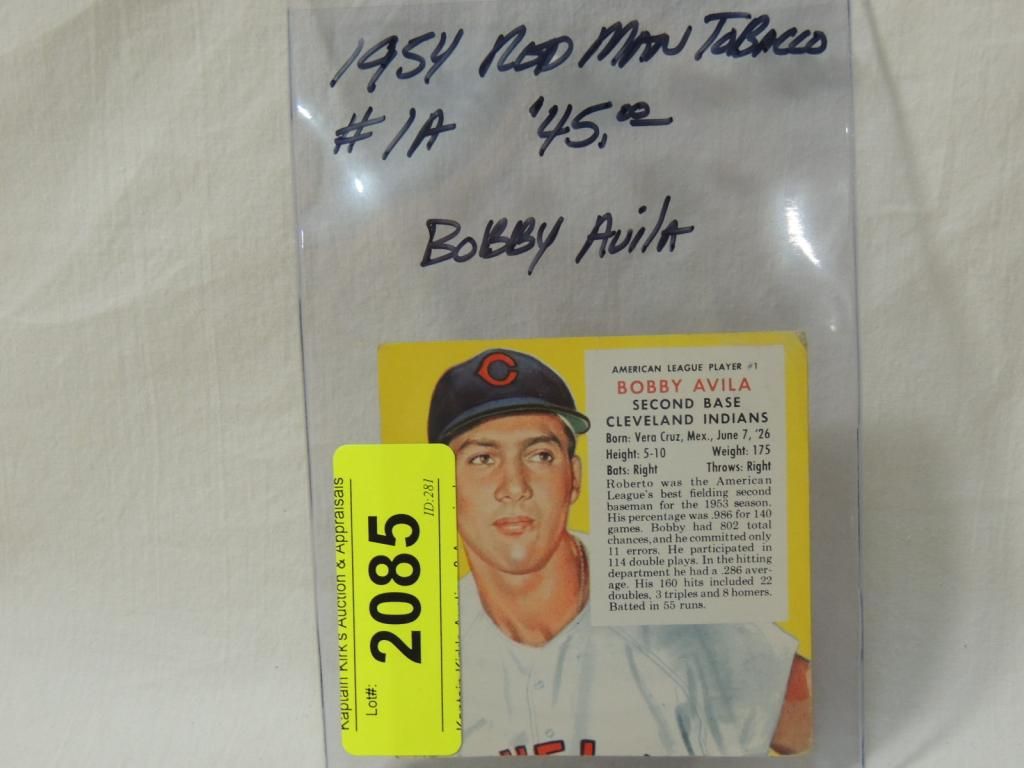 1954 RED MAN TOBACCO BOBBY AVILA # 1A BASEBALL CARD. BASEBALL COLLECTIBLE. VINTAGE CARD. GOOD CONDITION. IN PLASTIC SLEEVE. AS SHOWN. SEE PHOTO FOR MORE DETAILS.