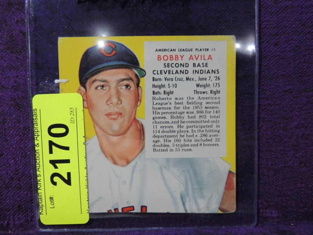 1954 RED MAN TOBACCO BOBBY AVILA # 1A BASEBALL CARD. BASEBALL COLLECTIBLE. VINTAGE CARD. GOOD CONDITION. IN PLASTIC SLEEVE. AS SHOWN. SEE PHOTO FOR MORE DETAILS.