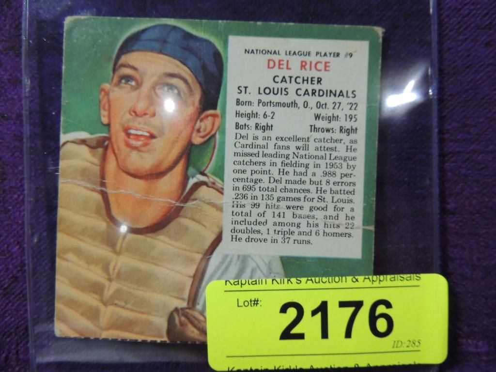 1955 RED MAN TOBACCO DEL RICE 9N BASEBALL CARD. BASEBALL COLLECTIBLE. VINTAGE CARD. GOOD CONDITION. IN PLASTIC SLEEVE. AS SHOWN. SEE PHOTO FOR MORE DETAILS.
