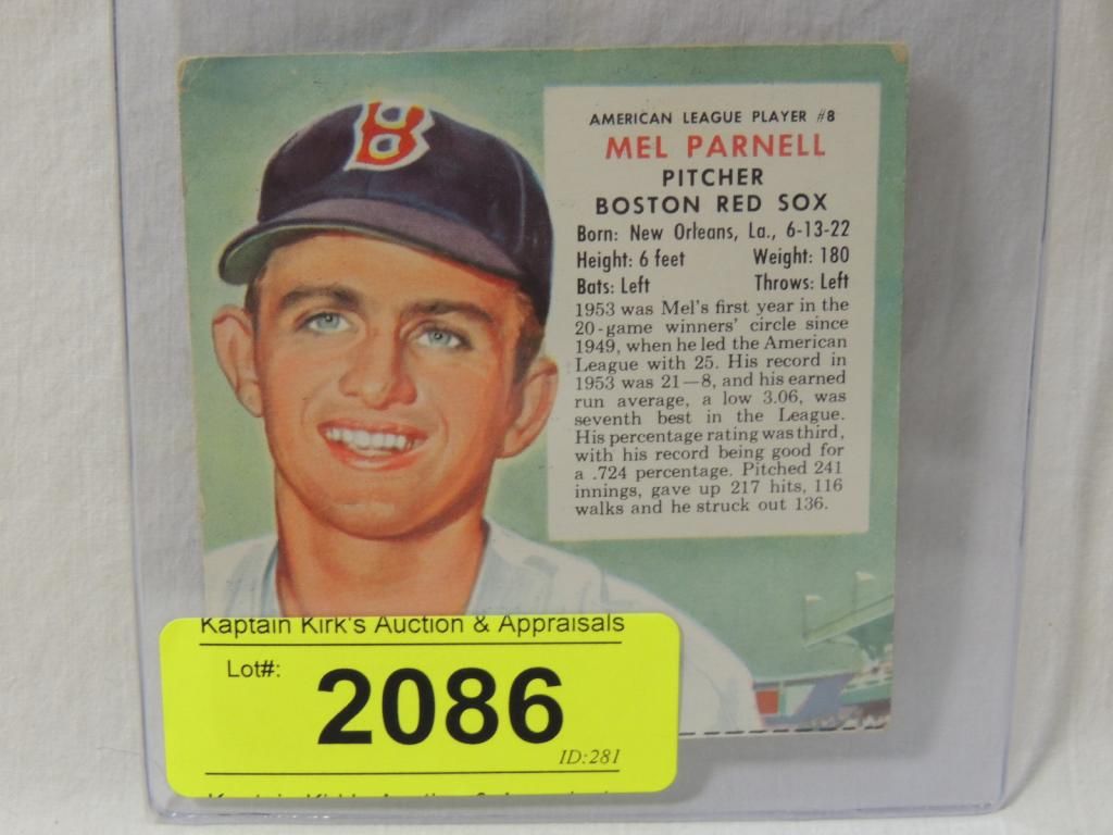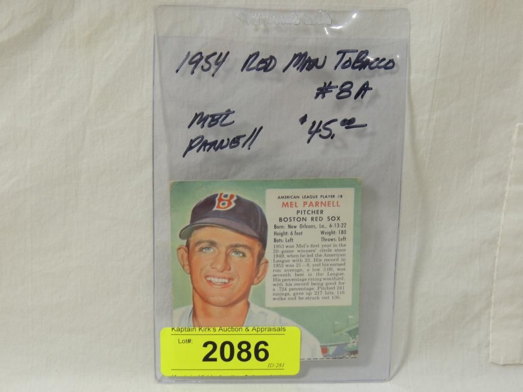 1954 RED MAN TOBACCO MEL PARNELL 8A BASEBALL CARD. BASEBALL COLLECTIBLE. VINTAGE CARD. GOOD CONDITION. IN PLASTIC SLEEVE. AS SHOWN. SEE PHOTO FOR MORE DETAILS.