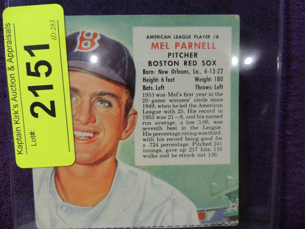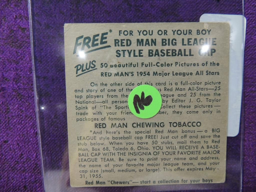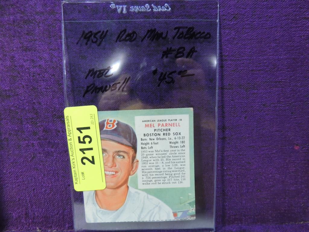 1954 RED MAN TOBACCO MEL PARNELL 8A BASEBALL CARD. BASEBALL COLLECTIBLE. VINTAGE CARD. GOOD CONDITION. IN PLASTIC SLEEVE. AS SHOWN. SEE PHOTO FOR MORE DETAILS.